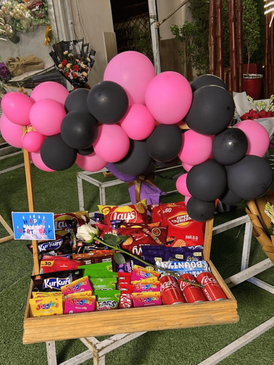 Yeh Grand Snack Tray har age group ke logon ke liye Birthday Celebration ka ek ultimate gift hai. Ismein Chips (Lay’s, Kurkure), Chocolates (Bounty, Super Crisp), Candies (Jiggly, Skittles), aur Cold Drinks (Cans) ka ek boobsurt aur bhara hua assortment hai. Tray mein ek Single White Rose ka touch diya gaya hai. Iska sabse attractive feature hai iske oopar bani hui Pink aur Black Balloons ki decorative arch, jo isko ek proper Party Look deti hai. Tray mein ek ‘Happy Birthday’ Card bhi shamil hai. Yeh gift Friends aur Family ko unki Birthday par Fun, Enjoyment aur Awaaz ke saath wish karne ke liye perfect hai. Aap isse apni Snack/Hampers category mein high-value item ke taur par list kar sakte hain.