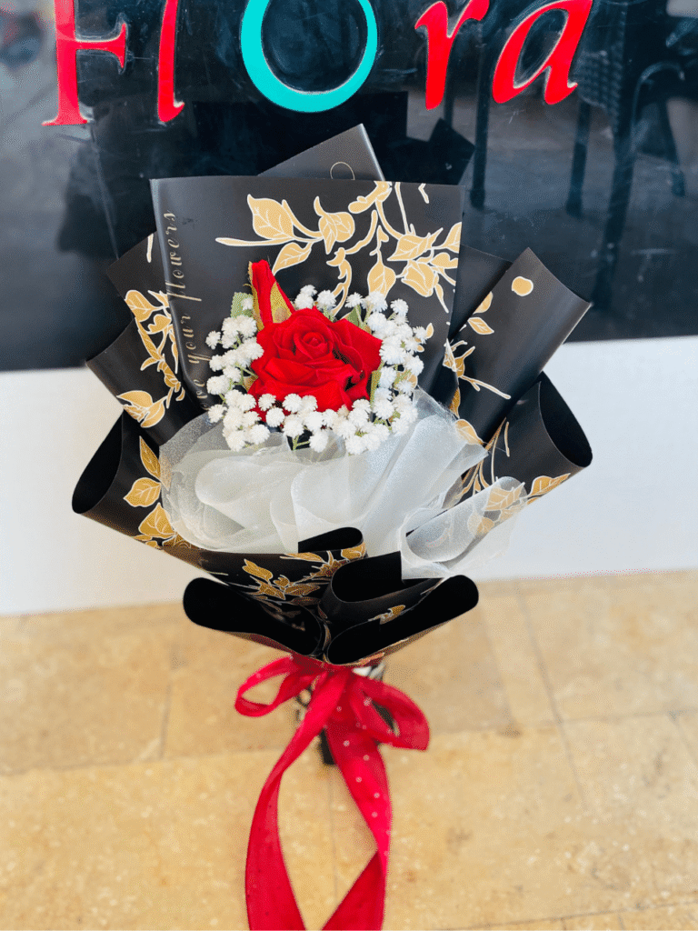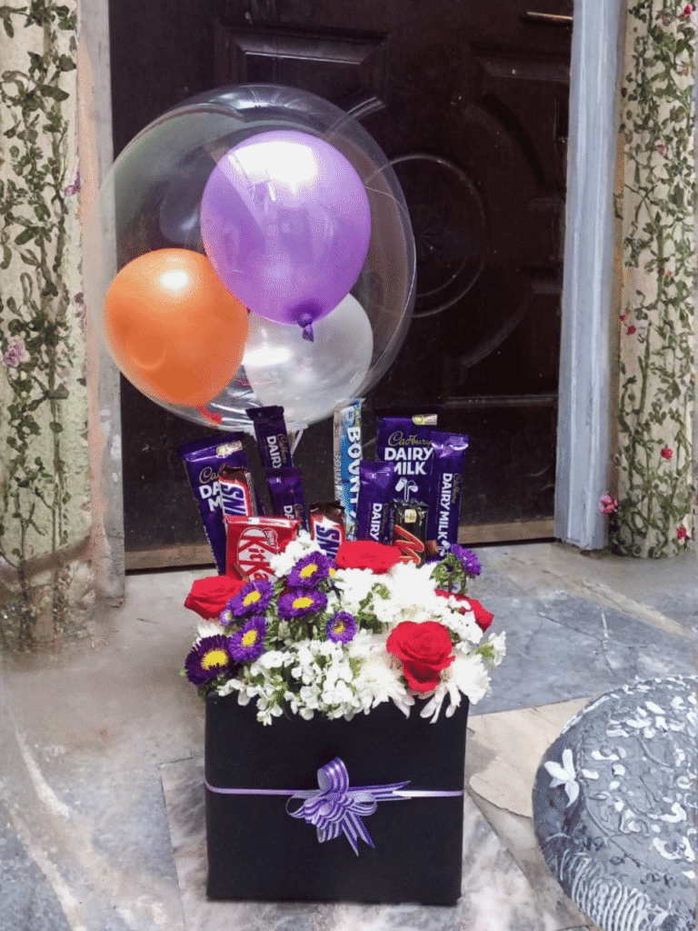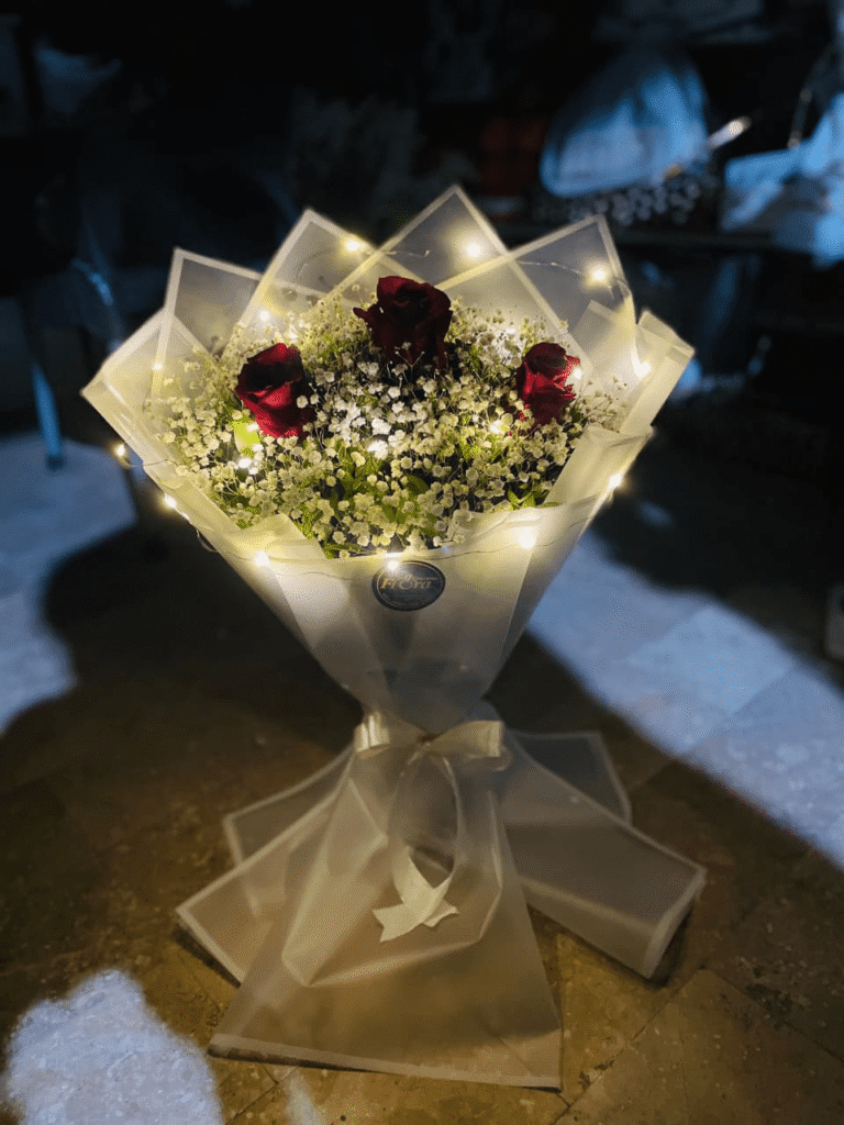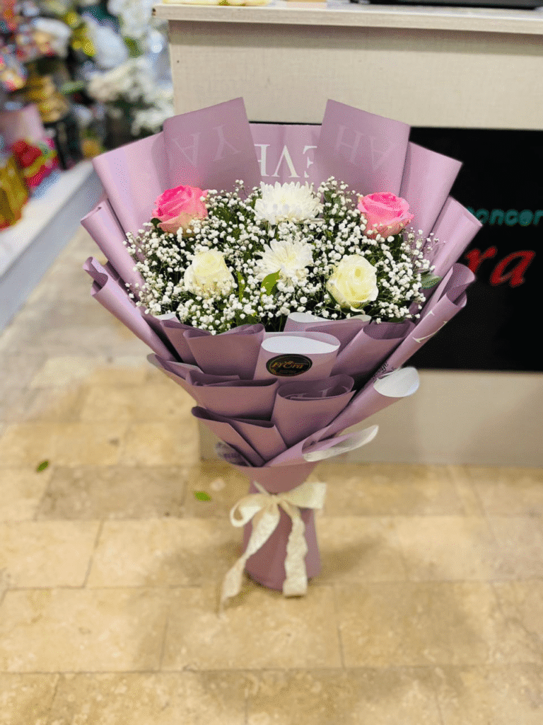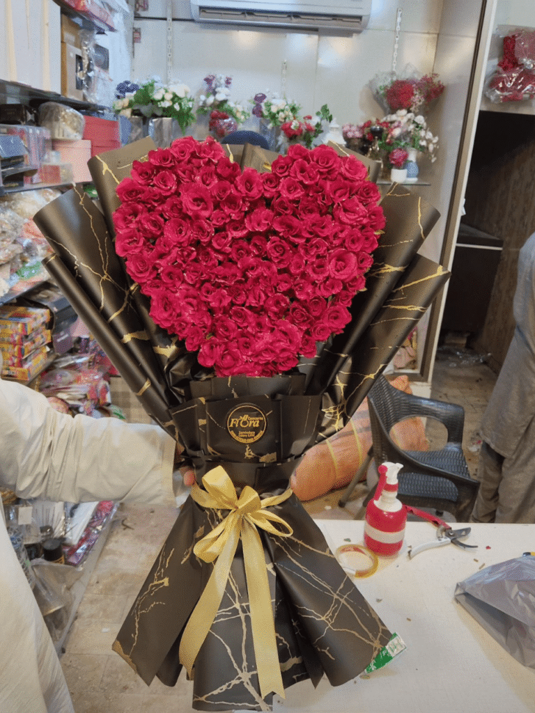 Yeh bouquet un logon ke liye ideal hai jo Unique Colors, Grandeur aur Strong Emotions ko express karna chahte hain. Ismein Deep Red Roses (Passion) ka cluster hai. Inke saath Tall White aur Blue-Dyed Gladiolus Stems hain, jo isko height aur Trust/Strength ka message dete hain. Flowers ko Baby’s Breath aur Greenery ka support mila hai. Bouquet ki Wrapping bohot hi striking aur vibrant hai: Sky Blue Paper ki layered folding, jiske andar White Wrap ka touch hai. Blue aur Red ka contrast isko bohot hi Attractive aur Energetic Appeal deta hai. Yeh bouquet Birthday, Corporate Success, Ya Jab Aap Kuch Bohat Different gift dena chahte hain, tab ke liye behtareen choice hai.