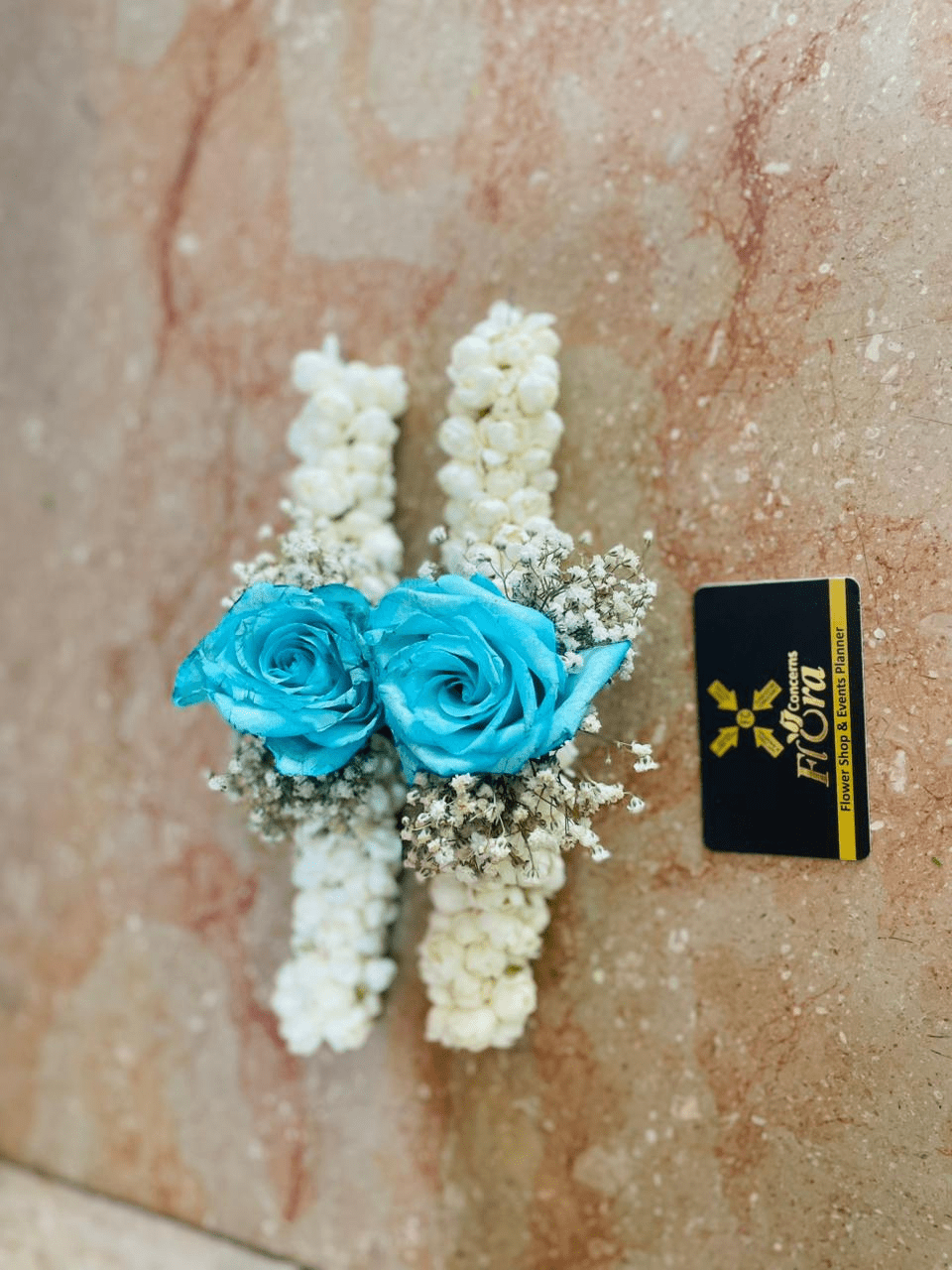 Yeh Gajra Bracelet un khawateen ke liye perfect hai jo Traditional Fragrance ke saath Modern Color ka touch chahti hain. Ismein Khushboo-daar White Motiya (Jasmine) ki ladi (string) hai, jo Purity aur Traditional Beauty ko signify karti hai. Is Motiya ki ladi ke center mein Do (2) Striking Blue Roses aur chota sa Baby’s Breath ka touch hai. Blue Roses Trust, Loyalty, aur Mystery ko represent karte hain, aur White Motiya ke saath milkar bohot hi Cool aur Unique Contrast create karte hain. Yeh Gajra Bracelet Mehndi, Mayoun, Sangeet, Ya Kisi Bhi Festive Event par haath mein pehenne ke liye ek behtareen accessory hai.