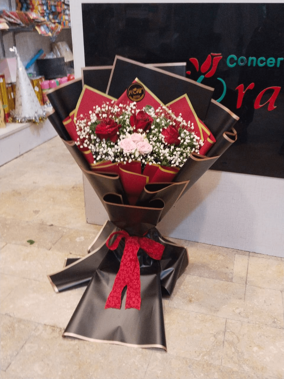 Passion aur Elegance ka Striking Combo! Deep Red aur Soft Pink Roses ka mix, ghane Baby’s Breath aur Stylish Black & Maroon luxury wrap mein. A dramatic and passionate gift.
