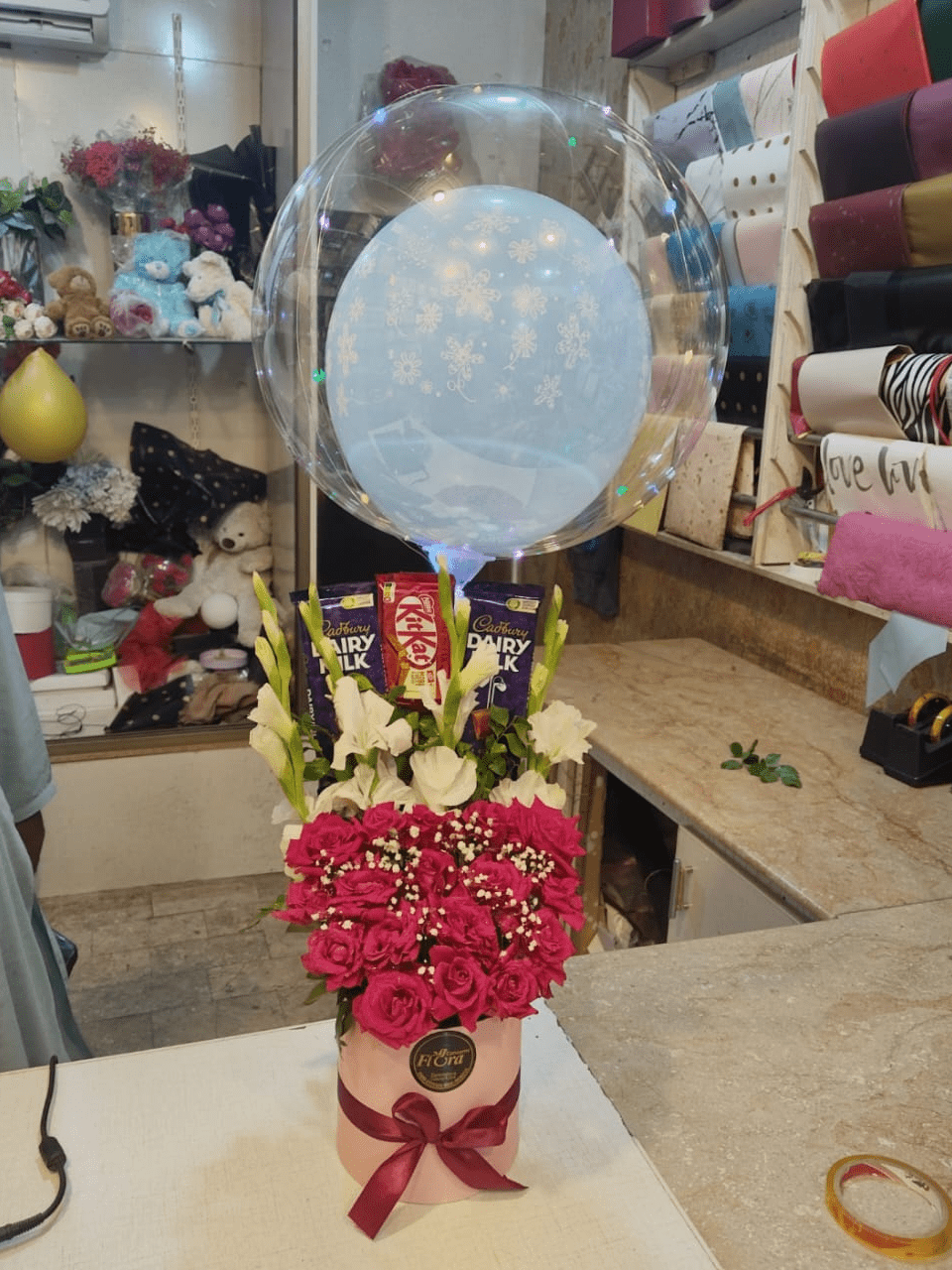 Yeh Flower Box Arrangement un logon ke liye design kiya gaya hai jo apne gift mein Wow Factor add karna chahte hain. Iske base mein Dozens of Deep Pink/Fuchsia Roses hain jo Admiration aur Gratitude ko darshate hain. Roses ke peechhe White Gladiolus aur White Roses ka mix hai, jo isko height aur elegance deta hai. Ismein Dairy Milk aur KitKat jaisi popular chocolates bhi shamil hain, jo isko aur bhi exciting bana dete hain. Magar iski sabse khaas baat iske oopar laga hua Large Transparent Bubble Balloon hai, jiske andar Snowflakes ka Blue/White design hai. Yeh balloon ek Dreamy aur Unique Look deta hai. Yeh gift box Anniversary, Birthday, Proposal, Ya Winter-Themed Event par dene ke liye ek behtareen aur memorable choice hai.