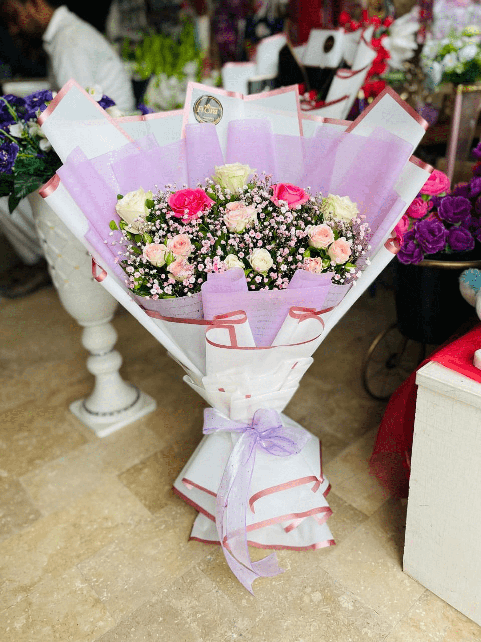 Yeh bouquet un logon ke liye ideal hai jo Variety, Nazakat aur Gentle Feelings ko express karna chahte hain. Ismein Soft Pink Roses (jo Grace aur Admiration ko signify karte hain) aur Creamy White Roses (jo Purity aur Izzat ka message dete hain) ka mix hai. Flowers ko bohot zyada Baby’s Breath ne ghera hua hai, jo isko ek ‘Cloud-like’ aur romantic look deta hai. Bouquet ki Wrapping bohot hi trendy aur attractive hai: Soft Lavender ya Lilac Paper ki layered folding, jiske saath White Paper aur Rose Gold/Pink Lining ka touch hai. Matching Lavender Ribbon iske charming look ko complete karta hai. Yeh bouquet Birthday, Anniversary, Ya Apne Partner ko Surprise dene ke liye ekdum perfect aur khoobsurat gift hai.