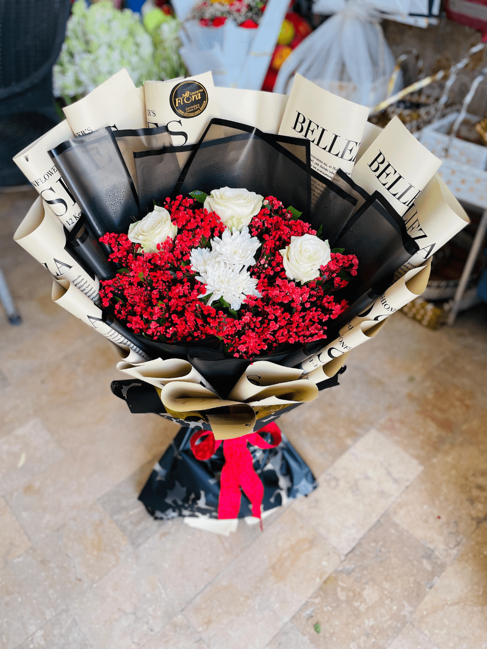 Stylish Elegance aur Passionate Look! Khubsurat White Roses aur striking Red Cloud Grass (filler) ka mix, designer Black aur Newspaper-style wrap mein. Bohot hi trendy aur attractive.