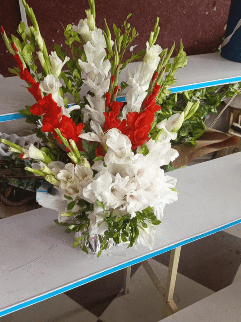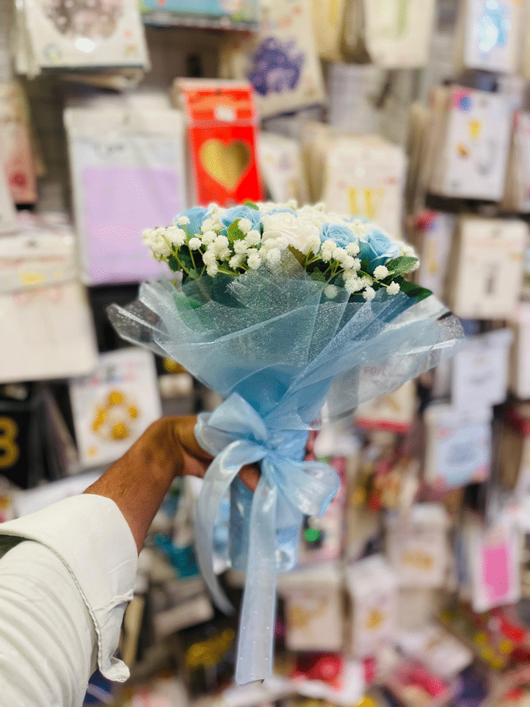 Yeh Snack Bouquet ek non-traditional aur bohot hi Exciting Gift Idea hai, jo har age group ke logon ko pasand aayega. Ismein Different Brands aur Flavours ke Chips ke packets (jaise Lay’s, Kurkure, Ringo Bingo) aur Chocolates/Mithai (jaise Cadbury Mini Fingers, Nimco, aur Gummy Bears) ka mix hai. In sabhi items ko carefully fan-shape mein arrange kiya gaya hai, bilkul ek flower bouquet ki tarah. Bouquet ki Wrapping bohot hi Vibrant hai: Bright Blue Paper aur Green Ribbon ka use hua hai, jo iske playful aur energetic look ko badha deta hai. Yeh bouquet Friend’s Birthday, Exam Pass Hone ki Celebration, ya Movie Night ke liye ekdum mazedar gift hai. Fresh flowers ki zaroorat nahi, iski appeal sirf Fun aur Flavours se banti hai!
