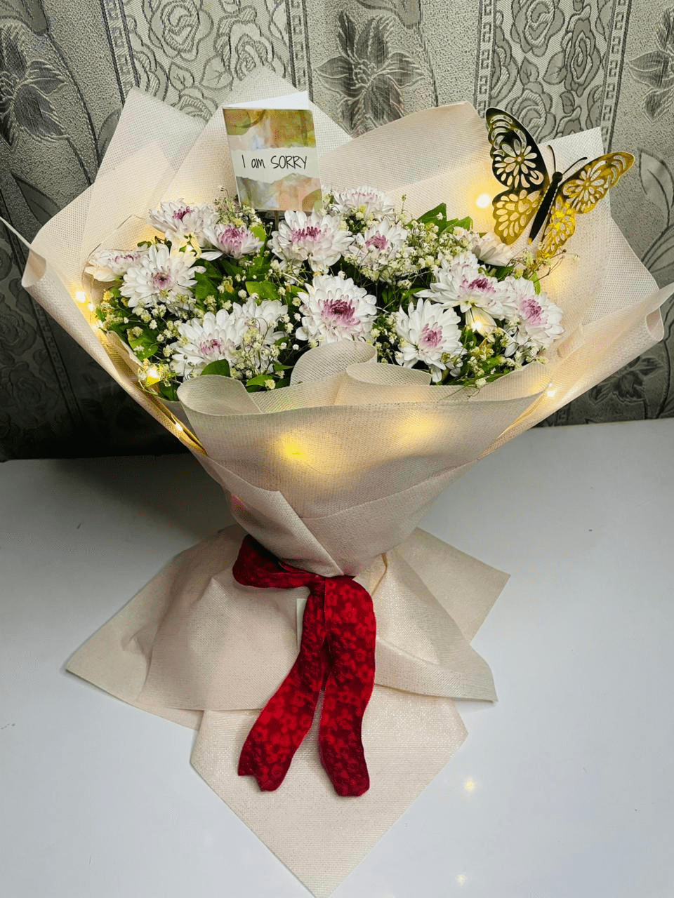 Sincerity, Purity aur Maafi ka Izhaar! White aur Pink Chrysanthemums ka bouquet, Fairy Lights aur Golden Butterfly ke saath, aur ‘I Am Sorry’ card laga hua. Perfect for a heartfelt apology.