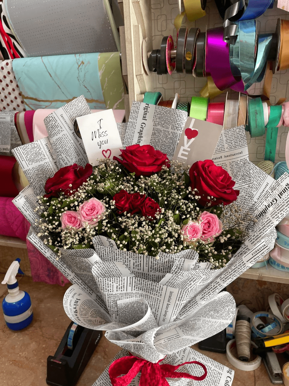 Yeh bouquet un logon ke liye perfect hai jo Bold Colors, High Volume aur Deep Emotions ko express karna chahte hain. Ismein Deep Red Roses (jo Passionate Love ko signify karte hain) aur Large White Chrysanthemums (jo Loyalty, Joy aur Purity ka message dete hain) ka mix hai. In sab ko ghane Baby’s Breath ne surround kiya hua hai. Bouquet ki Wrapping bohot hi bold aur classy hai: Matte Black Paper ka use hua hai, jiske saath White Paper aur Rose Gold/Pink lining ka touch hai. Neeche Vibrant Red Satin Ribbon bandha hua hai, jo iske bold floral colors ko highlight karta hai. Yeh bouquet Anniversary, Valentine’s Day, Ya Kisi Badi Celebration par dene ke liye ek behtareen aur yaadgar choice hai.