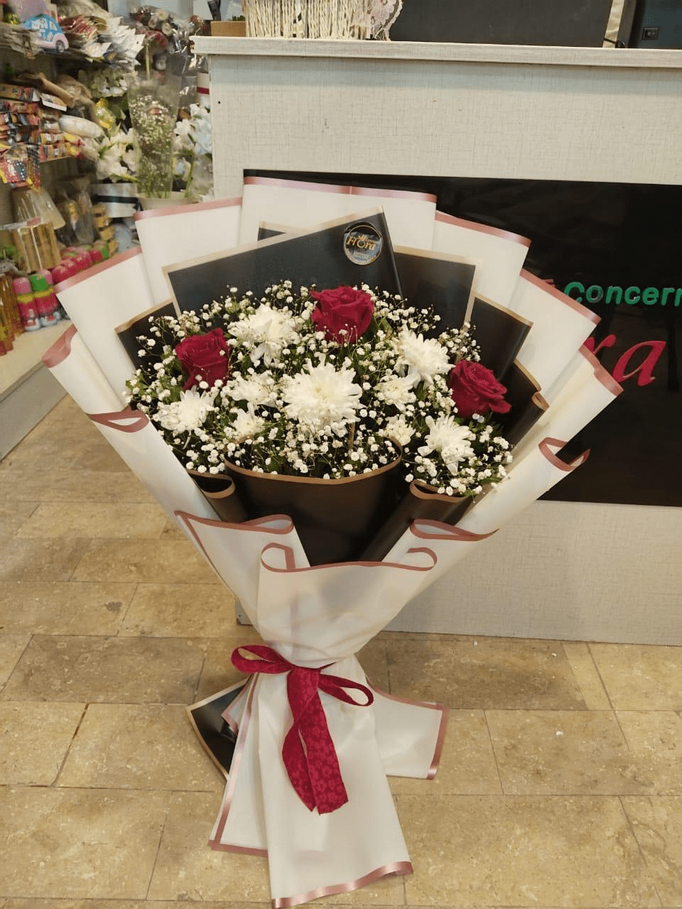 Passion aur Purity ka Shandaar Fusion! Deep Red Roses, Fluffy White Chrysanthemums aur Baby’s Breath ka guldasta, stylish Black & White luxury wrap mein. A truly powerful and impressive gift.