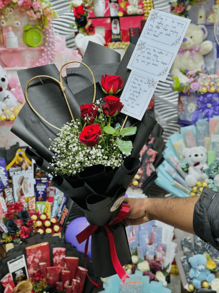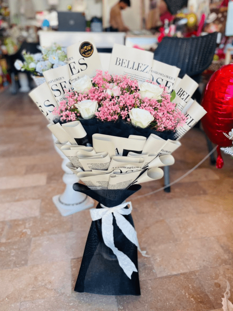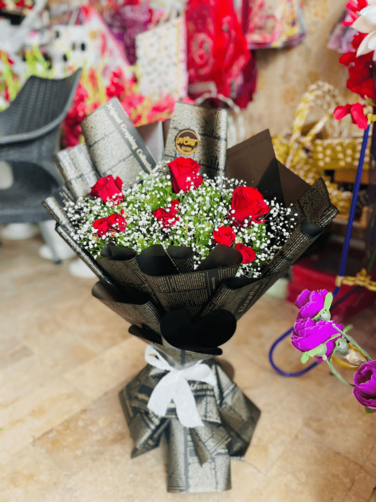 Striking Contrast: The subtle pop of red roses adds warmth and visual interest to the arrangement.