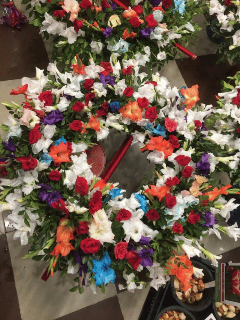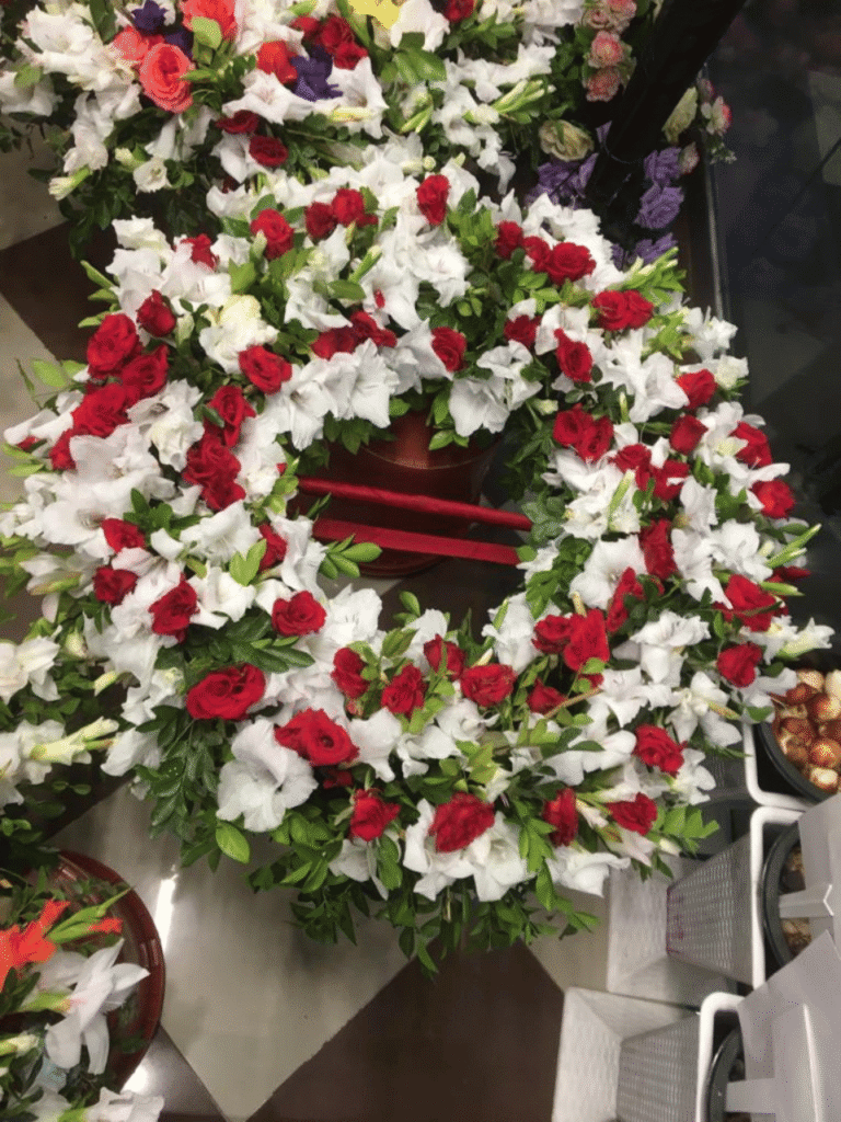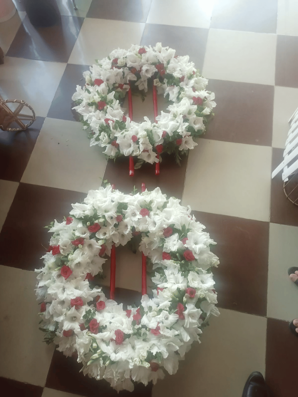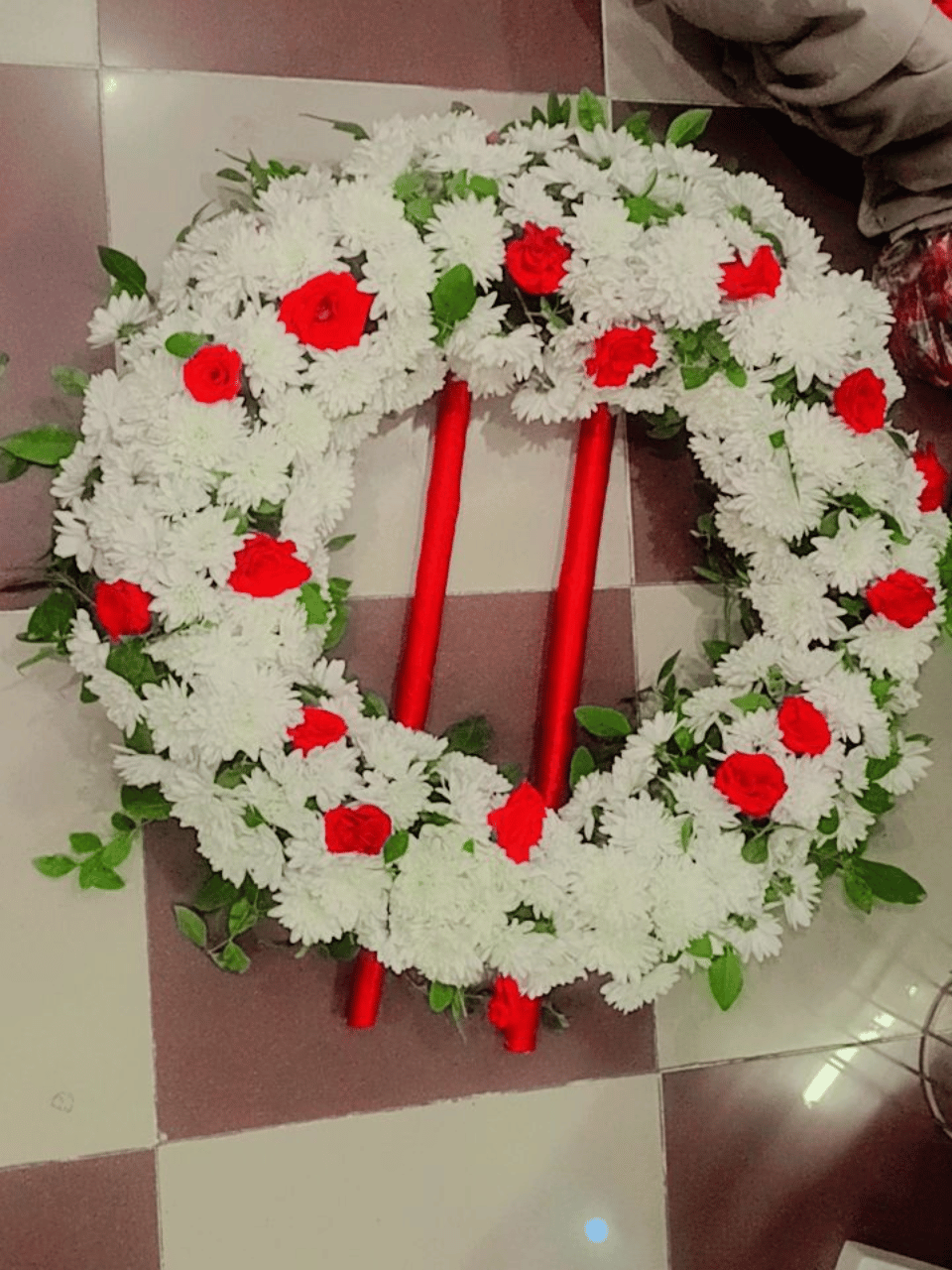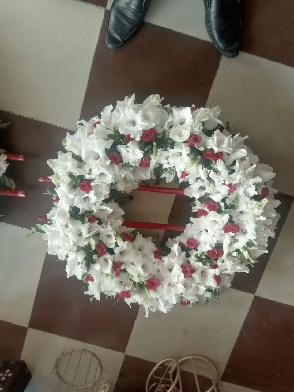 Hand-crafted to perfection, the wreath is densely packed with fresh White Gladiolus, creating a soft, cloud-like texture. Scattered Red Roses are placed artistically throughout the circle to provide a striking contrast that catches the eye without overpowering the design.