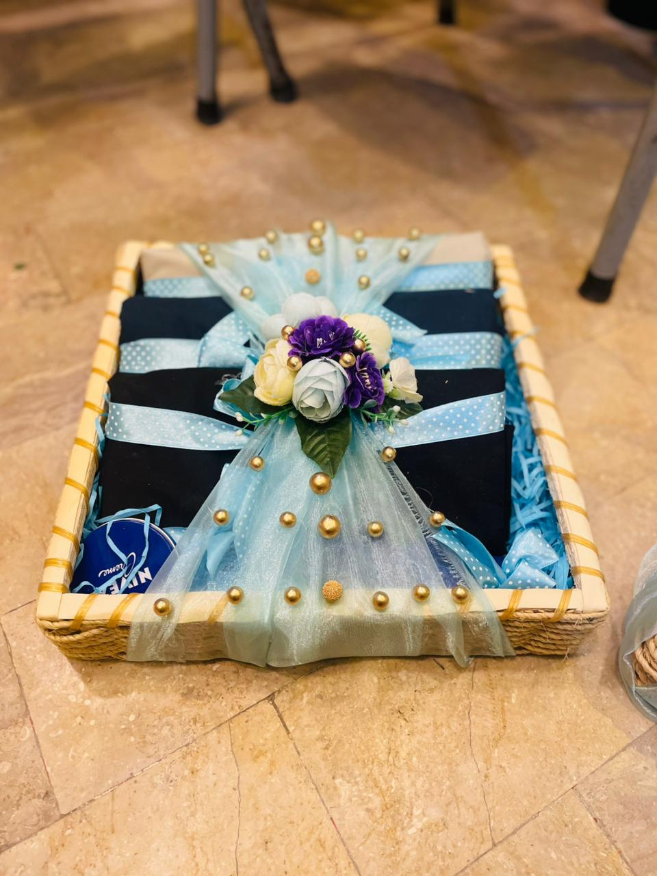 Yeh ek haseen bamboo/wicker ki tokri hai jise khas taur par libaas (apparel) aur gentleman’s grooming items ke liye tayyar kiya gaya hai. Basket ke andar dark blue/black color ke teen ya chaar unstitched suit pieces ya ready-made kurta shalwar neatly fold karke rakhe gaye hain, jinhein light blue dotted ribbon se bandha gaya hai. Basket ki sajawat mein sky blue net/organza ka istemaal kiya gaya hai, jiske upar sunahre motiyan (gold beads) aur creamy white/purple phoolon ka guldasta centrepiece ke taur par laga hai. Kapdon ke sath, Nivea ya isi tarah ka branded personal care item bhi shamil hai. Yeh basket dulha (groom) ke liye, Eid gift, Father’s Day, ya kisi khaas function mein saasural ki taraf se ya rishtedaron ki taraf se gift dene ke liye ek muqammal aur ba-izzat (respectful) tohfa hai. Iski presentation aur quality isse ek premium choice banati hai.