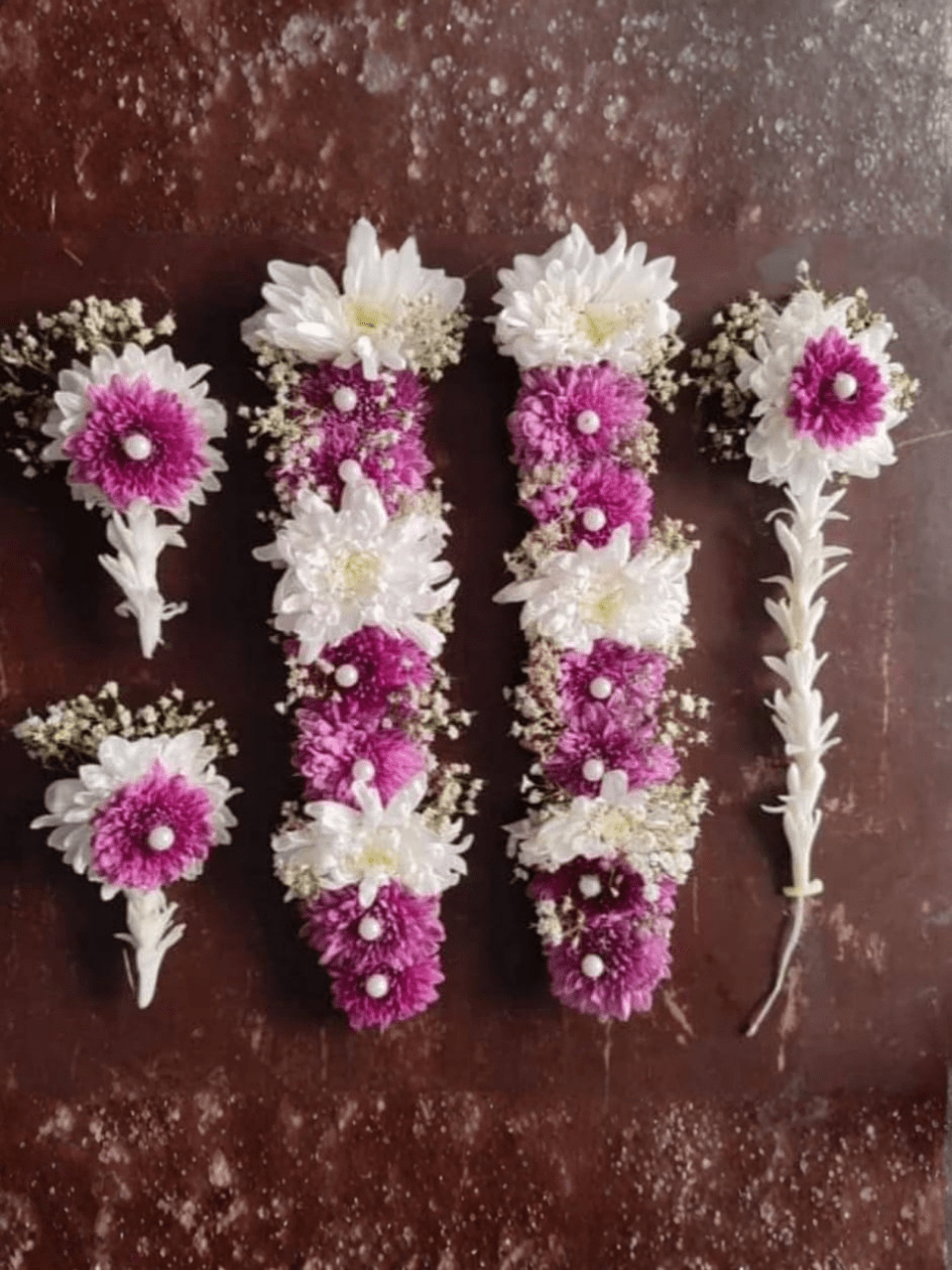 - Do (2) Long Gajra Bracelets: Jo wrist ya baazu par pehne jaate hain (Deep Purple/Maroon aur White Chrysanthemums ka mix, jismein pearls ka touch hai).