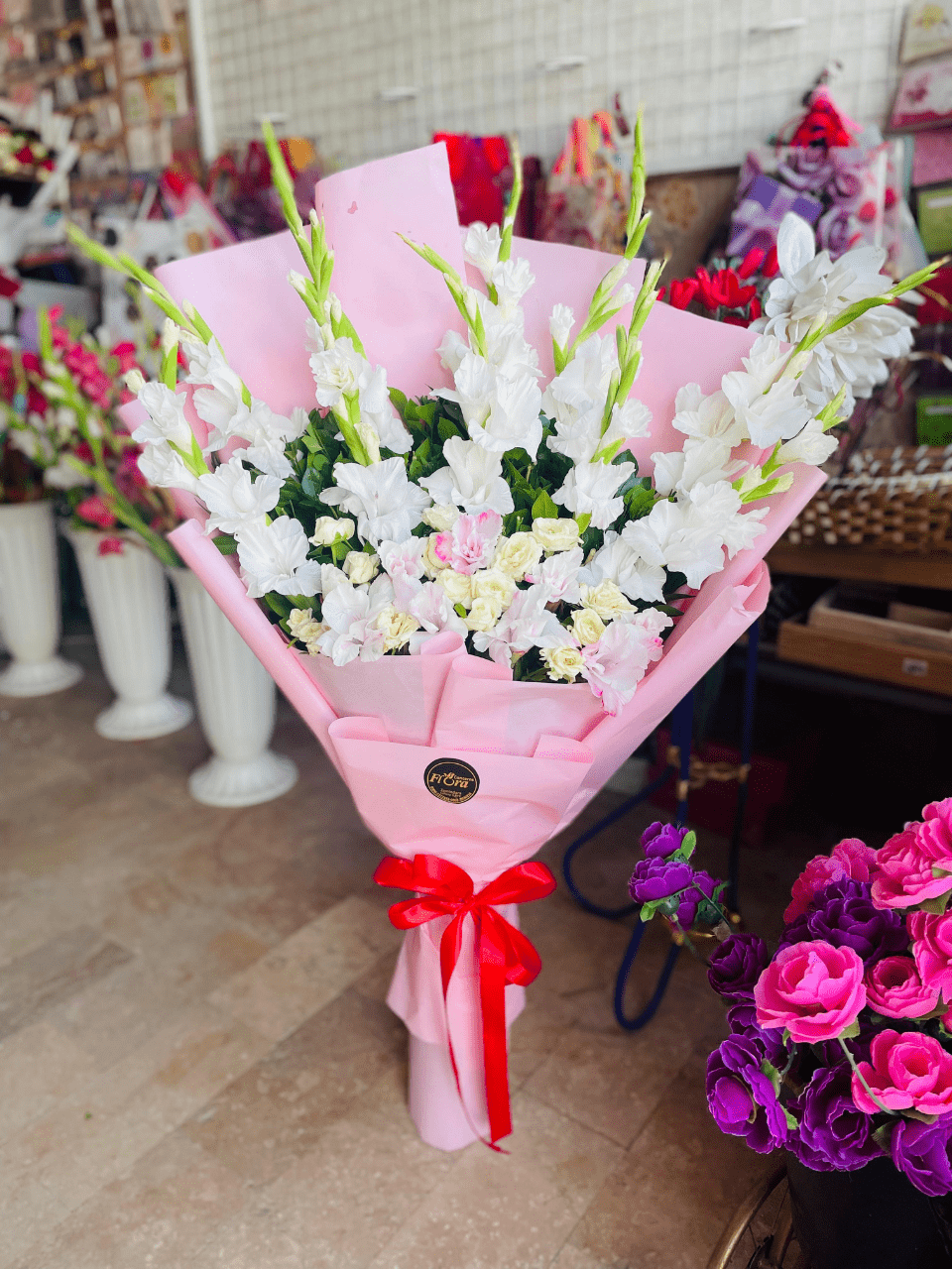 White Gladiolus ki lambi, shandaar stalks, halke gulabi aur safed chote roses (baby roses) ke saath. Soft pink wrapping mein lipat kar, yeh arrangement grace aur strength ka izhaar karti hai.