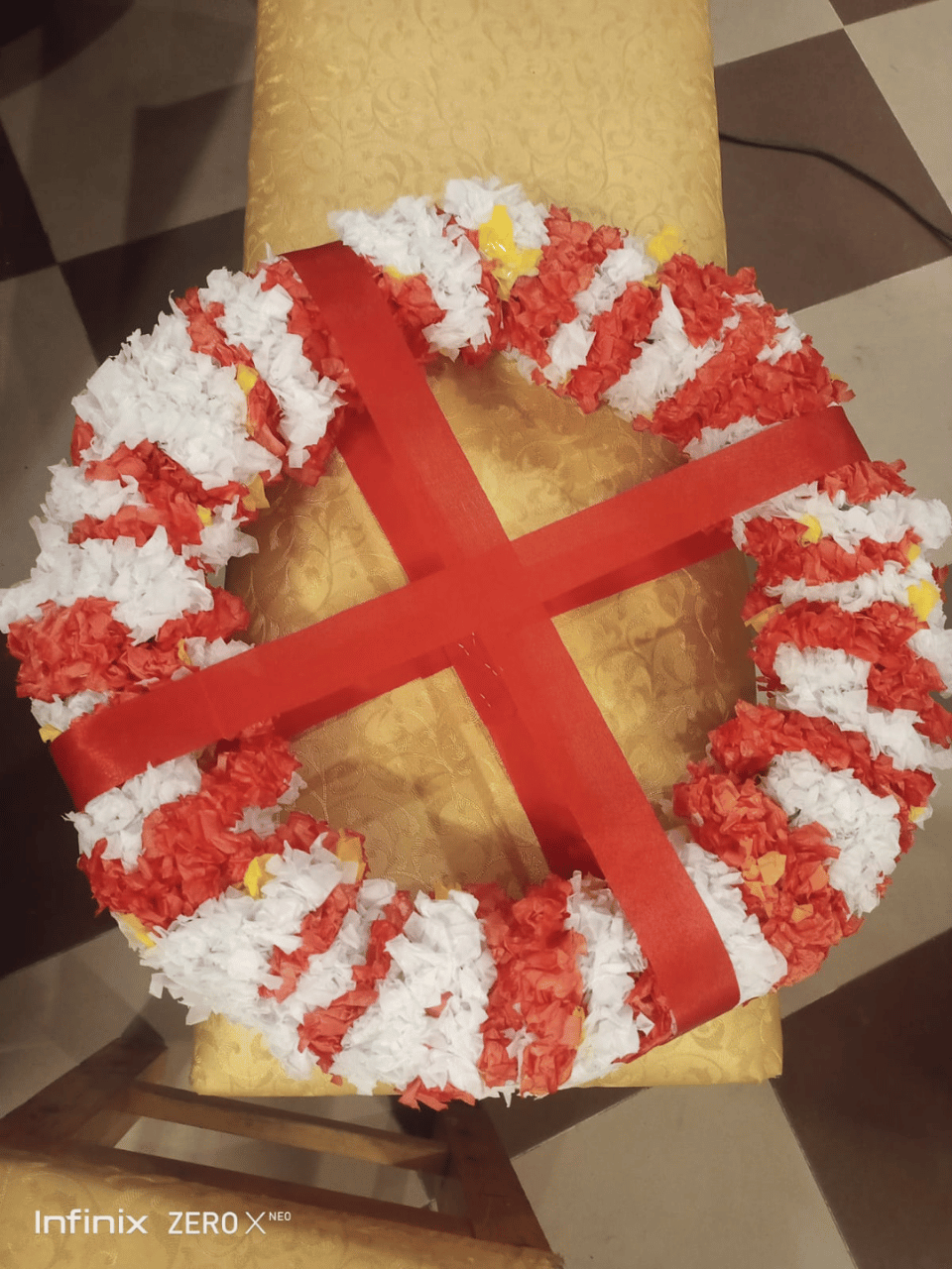 A durable and vibrant handcrafted wreath featuring alternating stripes of red and white artificial blooms. Completed with a bold red ribbon cross, this weather-resistant arrangement is perfect for rallies, long-distance transport, or lasting tributes.
