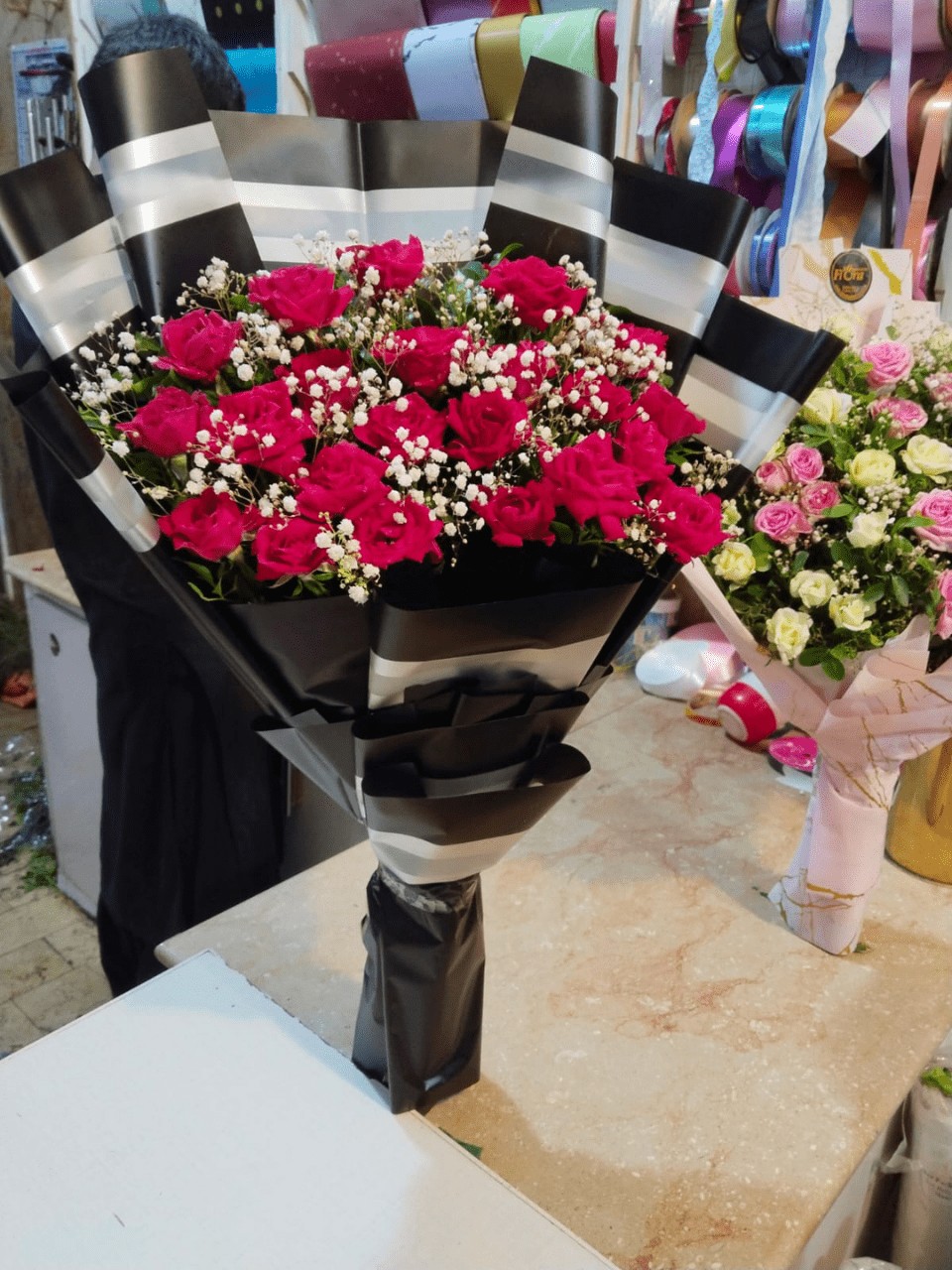 Yeh bouquet un logon ke liye ideal hai jo Bold Colors, Modern Presentation aur Luxury pasand karte hain. Ismein Dozens of Vibrant Fuchsia Roses (jo Intense Love, Joy aur Gratitude ko signify karte hain) ka istemaal hua hai. Flowers ko ghane Baby’s Breath ne surround kiya hua hai, jo inke bold colour ko balance karta hai. Bouquet ki Wrapping bohot hi classy aur dramatic hai: Matte Black Paper jispar White Horizontal Stripes hain, jo isko ek High-End aur Graphic Appeal deta hai. Neeche Black aur White Ribbon bandha hua hai. Yeh bouquet Anniversary, Valentine’s Day, Ya Apne Trendy Partner ki Birthday par dene ke liye ek behtareen aur yaadgar choice hai.