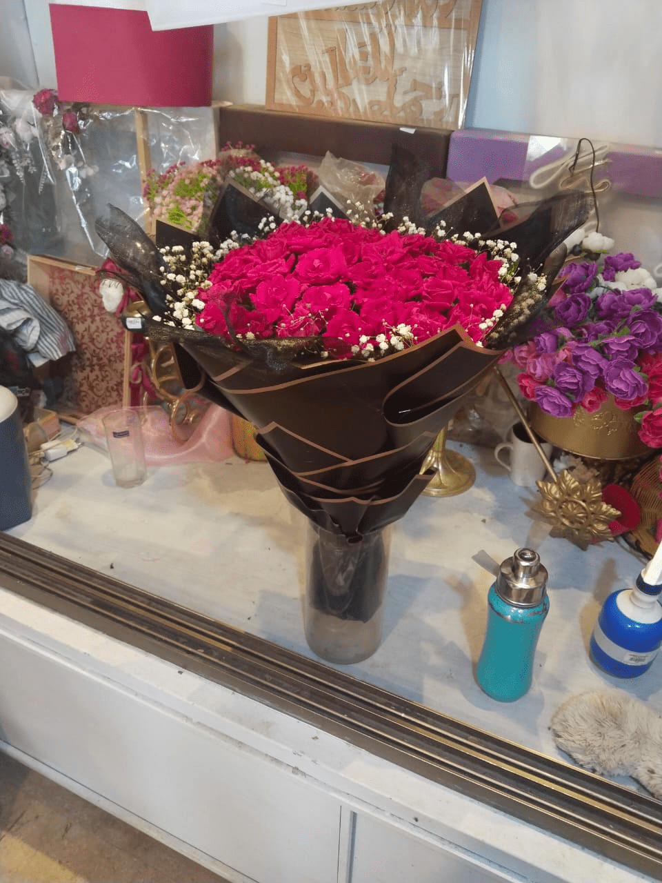 Ultimate Mohabbat aur Jazbaat ka Izhaar! Dozens of deep Fuchsia Roses aur Baby’s Breath ka bohot bada guldasta, Stylish Black Luxury Wrap mein beautifully packed. A show-stopping gift!