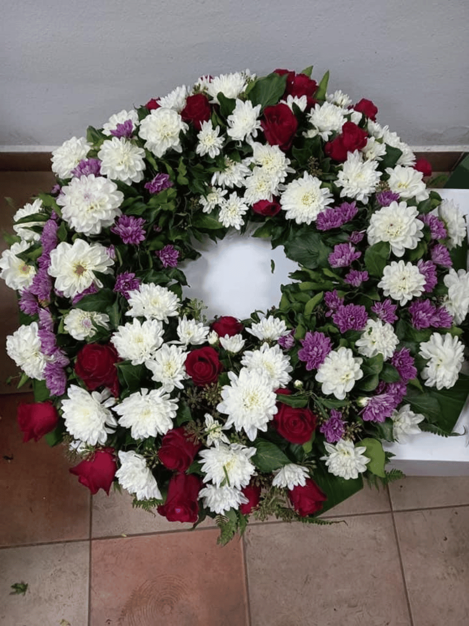 A uniquely textured standing wreath featuring lush white chrysanthemums, deep red roses, and accents of amethyst (purple) blooms. This distinguished arrangement symbolizes honesty, lasting memory, and sorrow, perfect for a deeply respectful tribute.