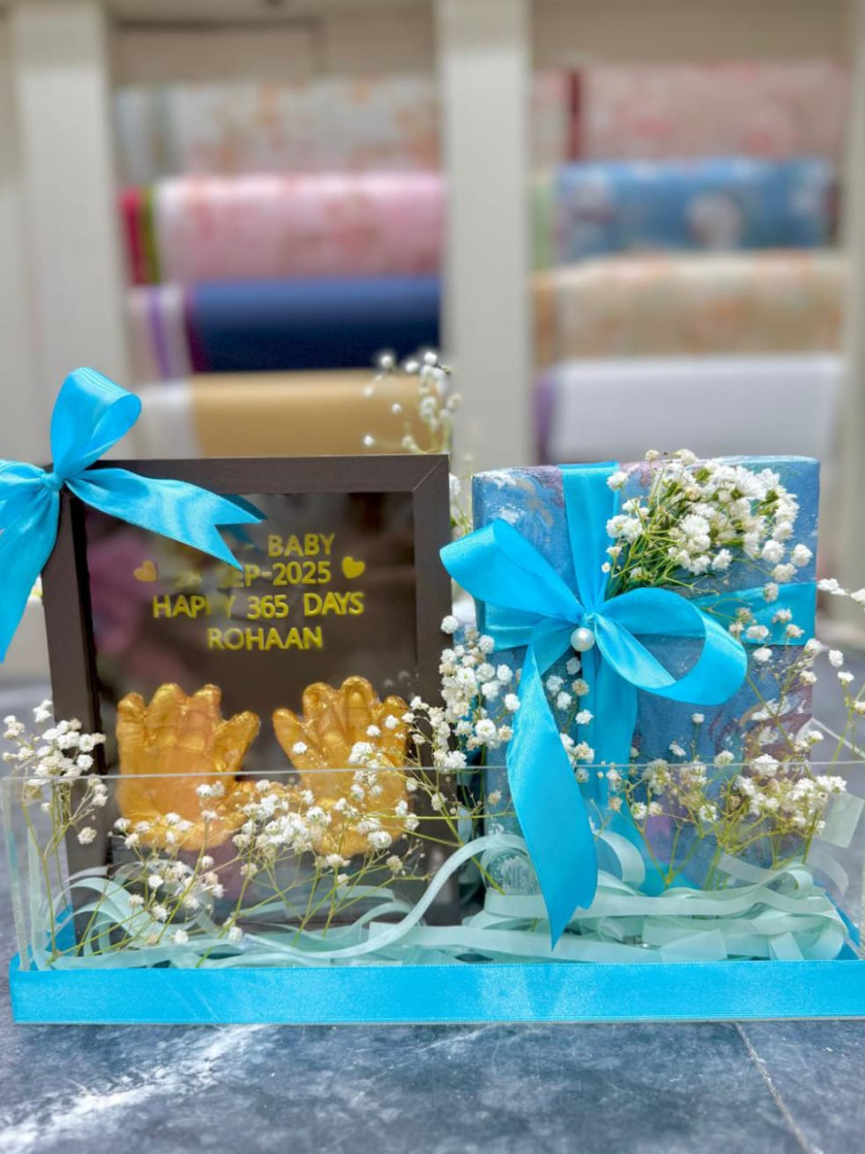 - The Keepsake Frame: Left side par aik stylish frame hai jismen golden-colored ya soap ki bani hui chote bache ke haath ki shakal (hand imprints) hain. Frame ke upar personalized text likha hai, jaise: “Baby’s Day Out – 2025, Happy 365 Days Rohaan,” jo pehle birthday ya pehle saal ki completion ko manata hai.