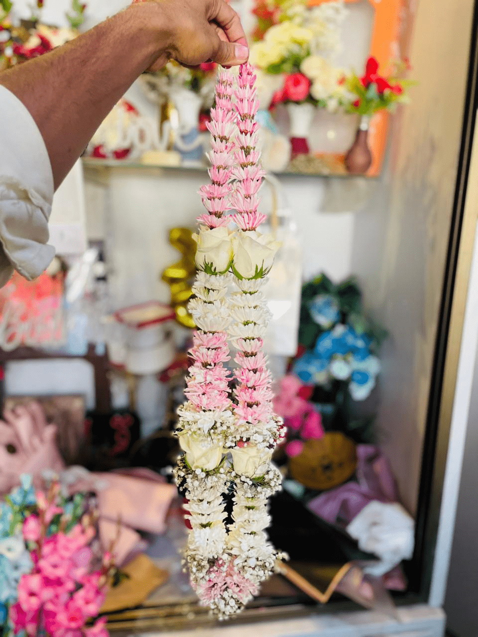 Yeh Floral Garland (Mala) un logon ke liye ideal hai jo Traditional Events, Nikkah Ceremony, Ya Mehmaan ki Izzat (welcoming guests) mein phoolon ka istemaal karna chahte hain. Ismein White/Cream Roses (jo Purity signify karte hain) aur Soft Pink Tubular Flowers (jo Grace aur Affection ka message dete hain) ka istemaal hua hai. Pink aur White flowers ki alternating (ek ke baad ek) layers isko bohot hi vibrant aur traditional look deti hain. White Roses ke clusters iski beauty ko badha dete hain. Yeh Mala Nikkah Ceremony, Mehfil, Welcome Gesture, Ya Stage/Table Decor ke liye ek behtareen aur yaadgar traditional item hai.