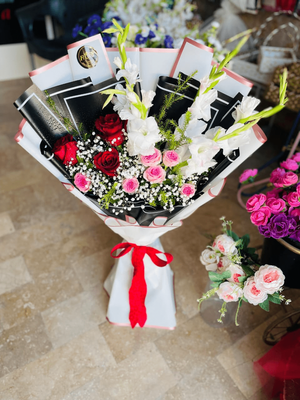 Passion, Grace aur Respect ka Shandaar Fusion! Deep Red aur Soft Pink Roses, Tall White Gladiolus ke saath, stylish Black & White luxury wrap mein. A truly impressive gift.