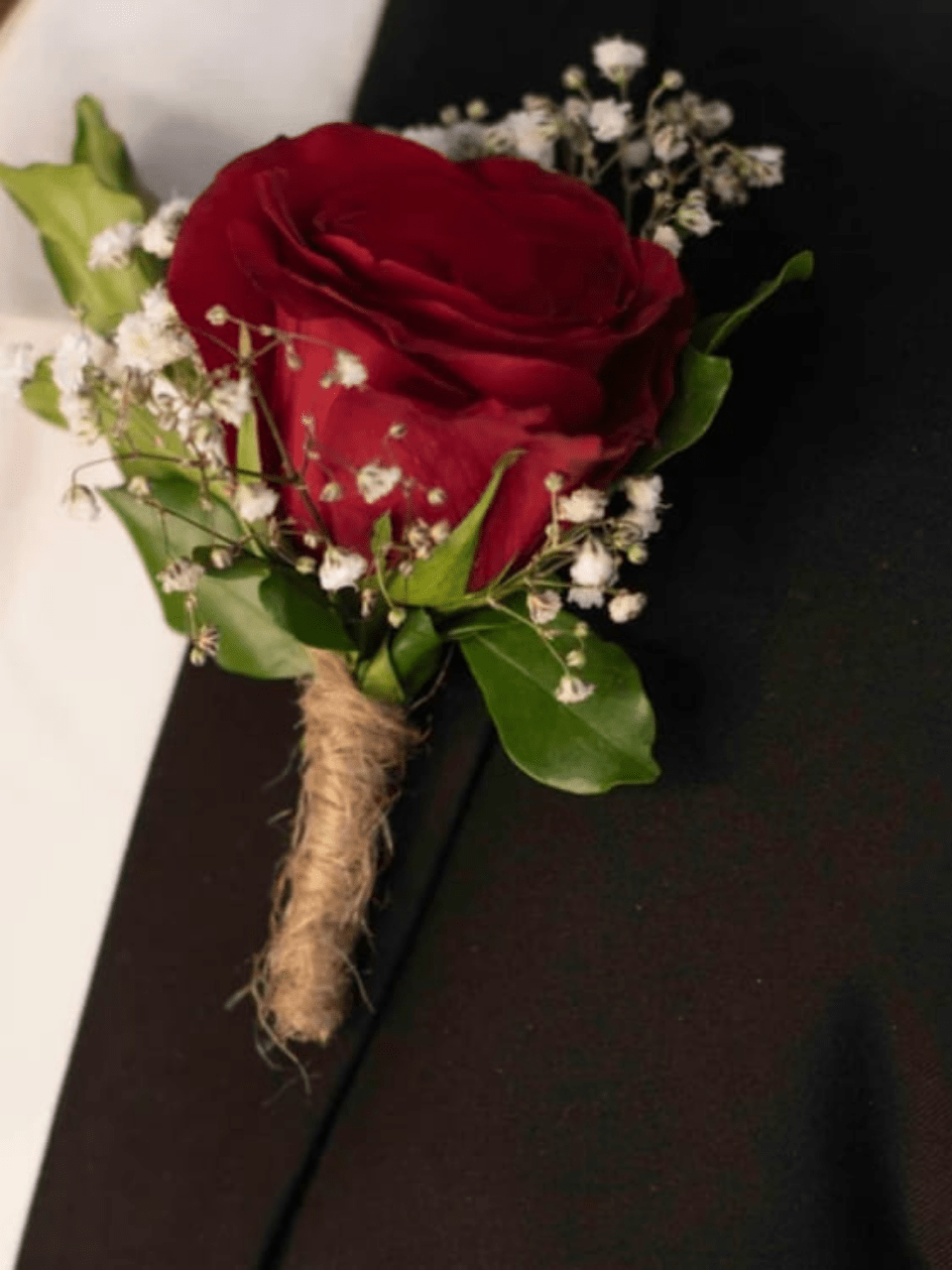 Elegance aur Passion ka Chota Sa Izhaar! Deep Red Rose, Baby’s Breath aur Greenery ka neat arrangement, Rustic Jute/Burlap Wrap ke saath. Perfect for Groom ya Groom’smen.