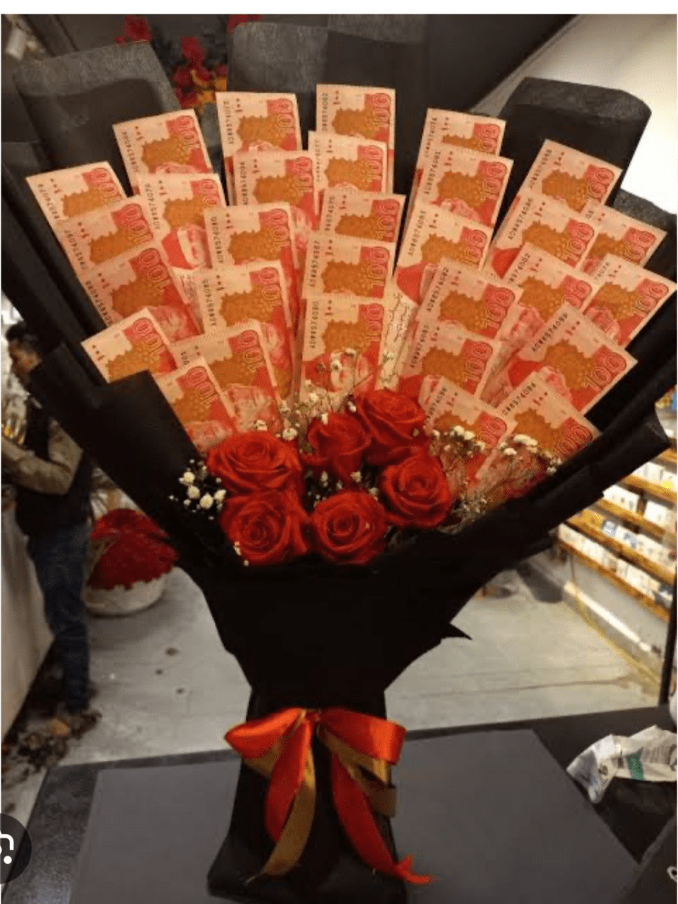 Yeh bouquet un logon ke liye ideal hai jo Cash ki Value aur Flowers ki Beauty dono ko ek saath gift karna chahte hain. Bouquet ke base mein Deep Red Roses (jo Passionate Love ko signify karte hain) aur delicate Baby’s Breath ka touch hai. Inke oopar Pakistani 100-Rupee Notes (ya client ki marzi ke mutabiq value) ko fan-shape mein fold karke arrange kiya gaya hai. Iski Wrapping bohot hi dramatic aur elegant hai: Matte Black Paper jo Flowers aur Notes ke colors ko bohot accha contrast deta hai. Neeche Red aur Golden Ribbon iske look ko complete karta hai. Yeh gift Birthday, Anniversary, Ya Engagement par dene ke liye ek behtareen tareeqa hai, kyunki yeh Thoughtful aur Valuable dono hai. (Note: Zaroor mention karein ke is bouquet ki total cost mein ‘Notes ki Value’ + ‘Floral Arrangement aur Wrapping Charges’ dono shamil honge. Notes ki value customized ho sakti hai.)