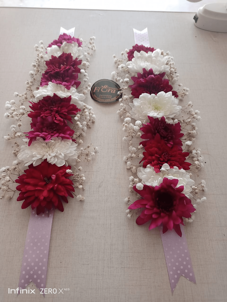 Yeh Gajra Bracelets ka Set un khawateen ke liye ideal hai jo Bold Traditional Colors aur Festive Look pasand karti hain. Is set mein Do (2) Long Gajra Bracelets shamil hain jo wrist ya baazu par pehne jaate hain. Ismein Deep Maroon/Fuchsia Chrysanthemums (jo Richness aur Passion signify karte hain) aur Fluffy White Chrysanthemums (jo Purity aur Izzat ka message dete hain) ka alternating (ek ke baad ek) arrangement hai. In sab ko Baby’s Breath ne surround kiya hua hai. Maroon aur White ka yeh contrast bohot hi Striking aur Elegant lagta hai. Yeh Gajra Bracelets Mehndi, Mayoun, Sangeet, Ya Dulhan ke Saathiyon ko dene ke liye ek behtareen aur traditional accessory hain.