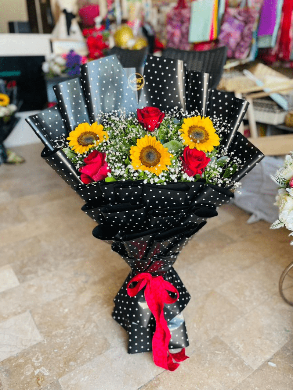 Agar aap kisi ko Joy, Liveliness, aur Deep Affection ka message dena chahte hain toh yeh bouquet perfect hai. Ismein Bright Yellow Sunflowers (Sooraj Mukhi) hain, jo Khushi, Worship, aur Lambi Zindagi (Longevity) ko represent karte hain, aur inke saath hain Deep Red Roses jo Passionate Love ko zahir karte hain. In dono Vibrant colors ko balance kiya gaya hai Baby’s Breath ki purity aur softness ke saath. Bouquet ki Wrapping bohot hi trendy aur fun hai: Black paper par White Polka Dots, aur neeche Red Ribbon, jo iske playful aur energetic look ko enhance karta hai. Yeh bouquet Friend’s Birthday, Get Well Soon, Ya Sirf Kisi ka Mood Acha Karne ke liye ekdum zabardast hai.