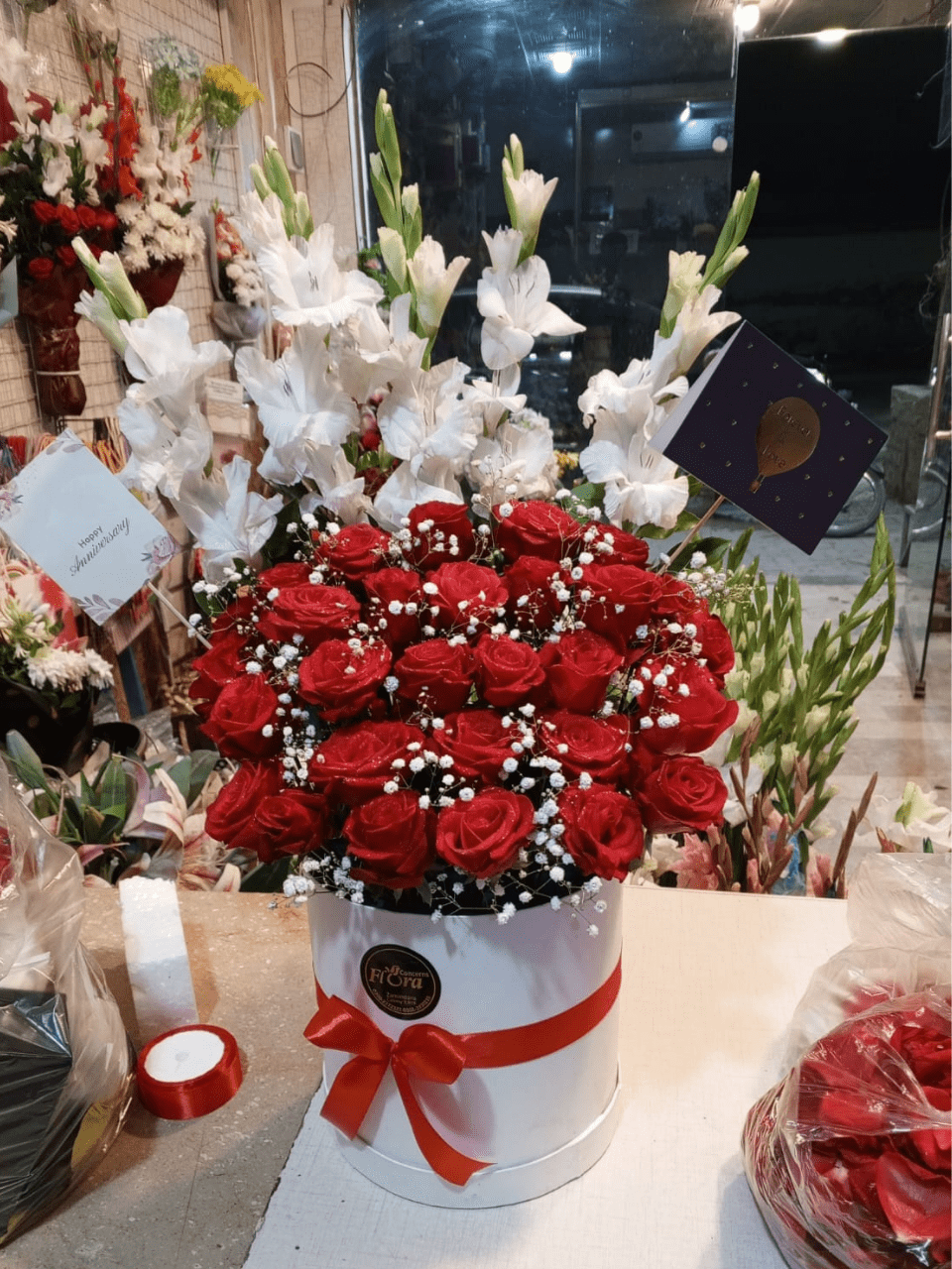 Passion, Grandeur aur Mohabbat Ka Ultimate Izhaar! Dozens of Deep Red Roses aur tall White Gladiolus ka shandaar arrangement, Elegant White Round Box mein. A memorable anniversary gift.