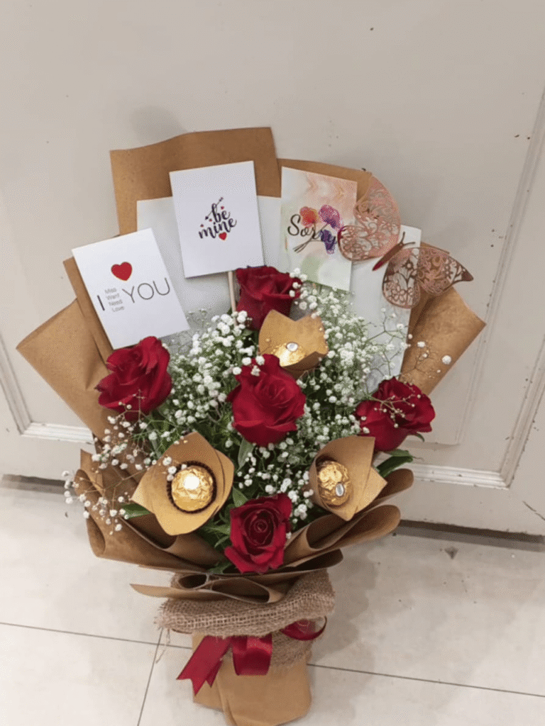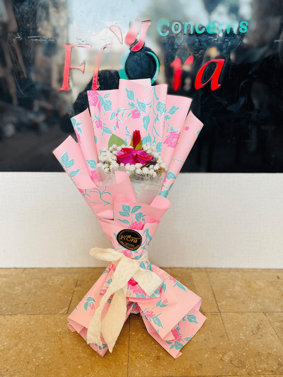 Agar aap kisi ko small, thoughtful aur cute gift dena chahte hain toh yeh bouquet perfect hai. Ismein Ek Ya Do Dark Pink/Fuchsia Roses ka istemaal hua hai, jo Admiration aur Joy ka message dete hain. Roses ko surrounding Baby’s Breath ek delicate aur soft look deta hai. Is bouquet ki sabse khaas baat iska Vibrant Pink Wrapping Paper hai, jis par Blue aur Pink leaf print bana hua hai. Yeh wrapping isko bohot Girly aur Trendy banati hai. Yeh bouquet First Date, A Friend’s Birthday, ya Thank You bolne ke liye best hai jab aap chahate hain ke gift sweet aur budget-friendly ho.