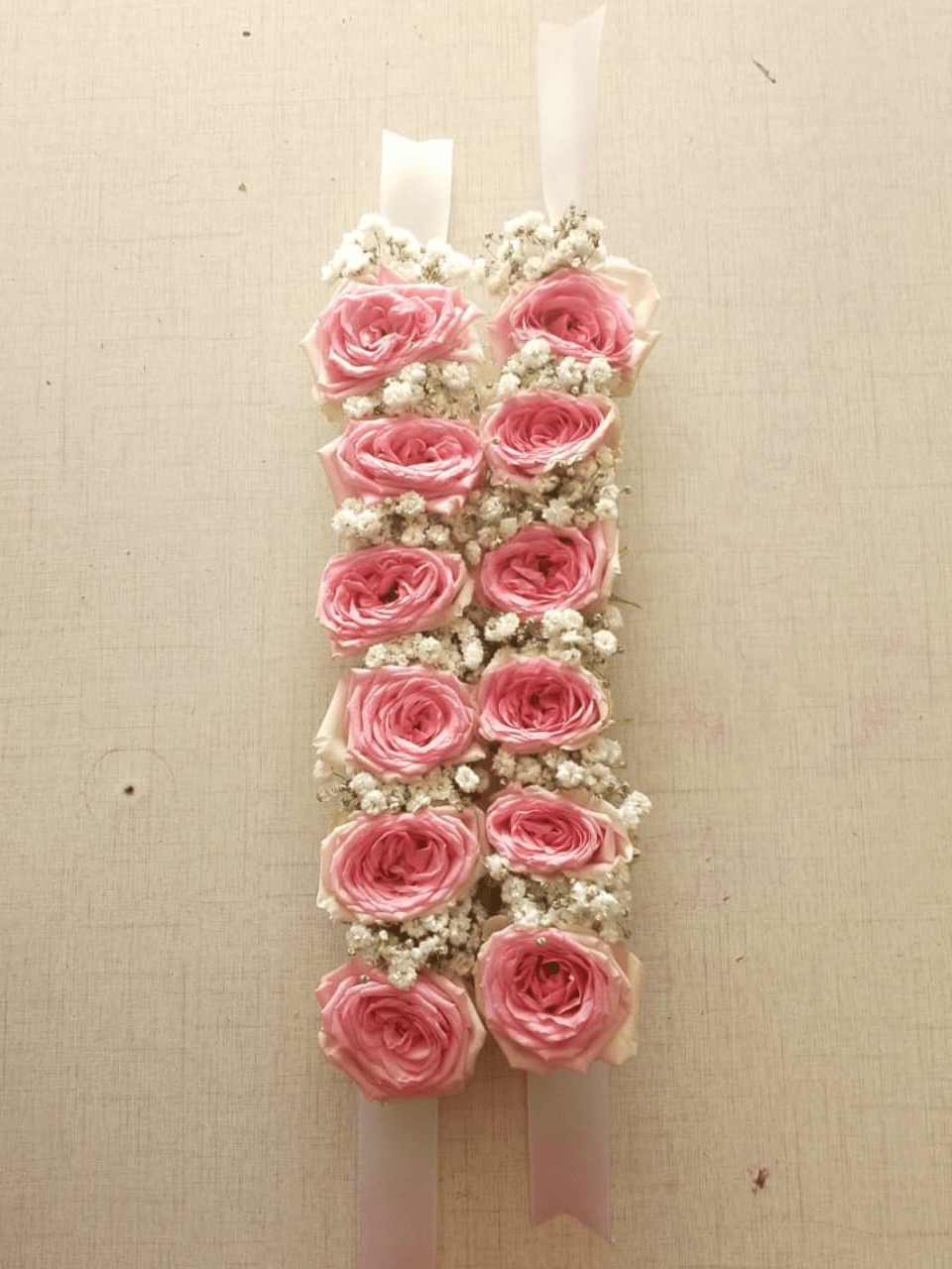 Yeh Gajra Bracelets ka Set un khawateen ke liye ideal hai jo Delicate, Romantic aur Matching Floral Jewelry pasand karti hain. Is set mein Do (2) Matching Gajra Bracelets shamil hain. Har bracelet mein Soft Light Pink Roses ka istemaal hua hai, jo Grace aur Gentle Affection ko signify karte hain. Har Rose ke paas Bohot Saara Baby’s Breath (Chote White Phool) laga hua hai, jo isko ek Airy aur Dreamy Look deta hai. Yeh Gajra Bracelets Mehndi, Mayoun, Baby Shower, Ya Dulhan ke Saathiyon ko dene ke liye ek behtareen aur traditional accessory hain. Inko Soft Pink Ribbons ke saath tie kiya gaya hai.