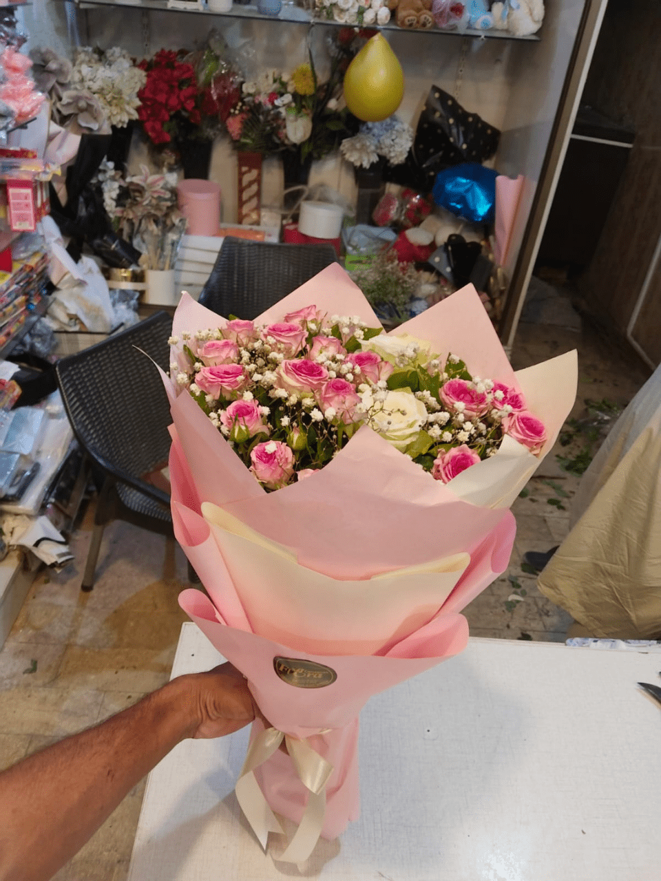 Grace aur Purity ka Hassen Sangam! Soft Pink aur White/Cream Roses ka mix, ghane Baby’s Breath aur delicate layered Pink wrap mein. Perfect for a gentle surprise.