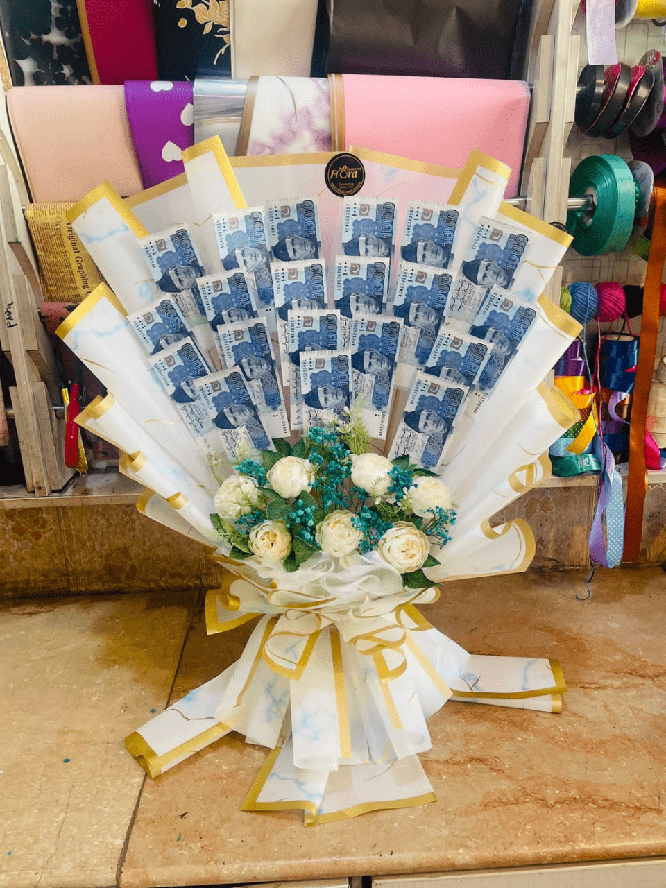 Rs. 1000 (ya pasandida) bank notes se bana hua luxury bouquet, safed aur sunahre (gold) border wali wrapping aur sajawati phoolon ke saath.