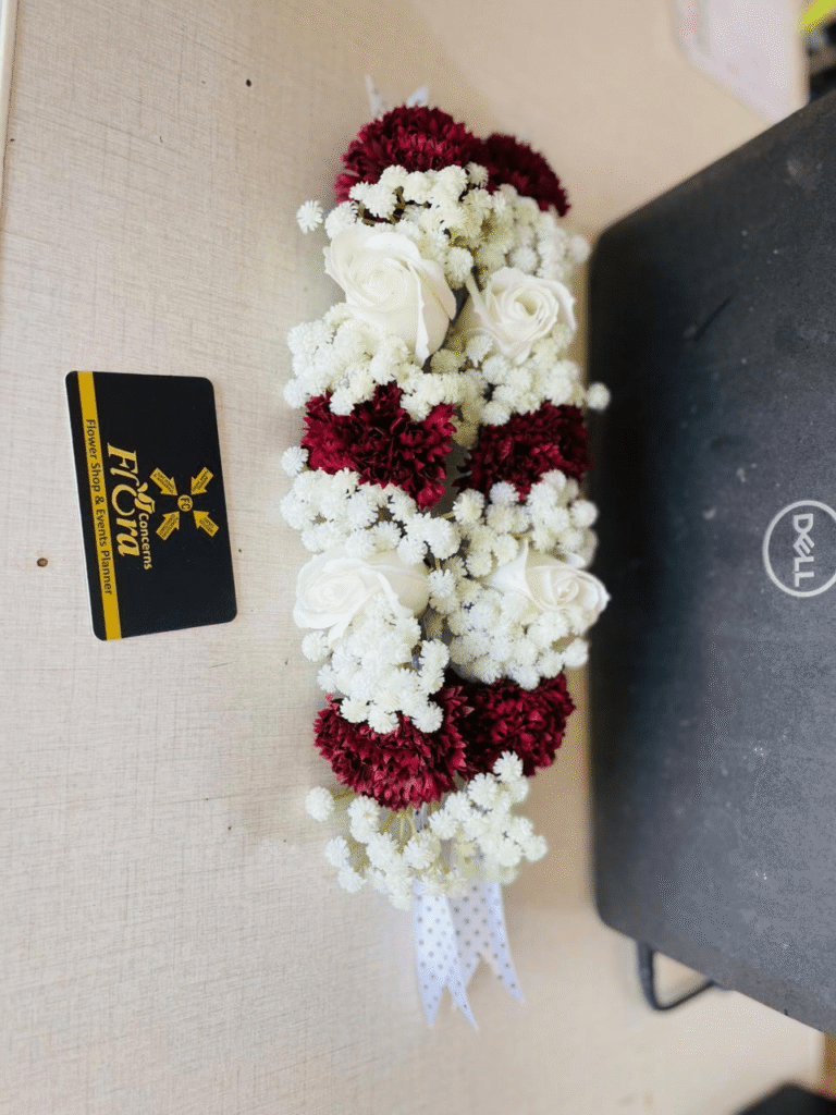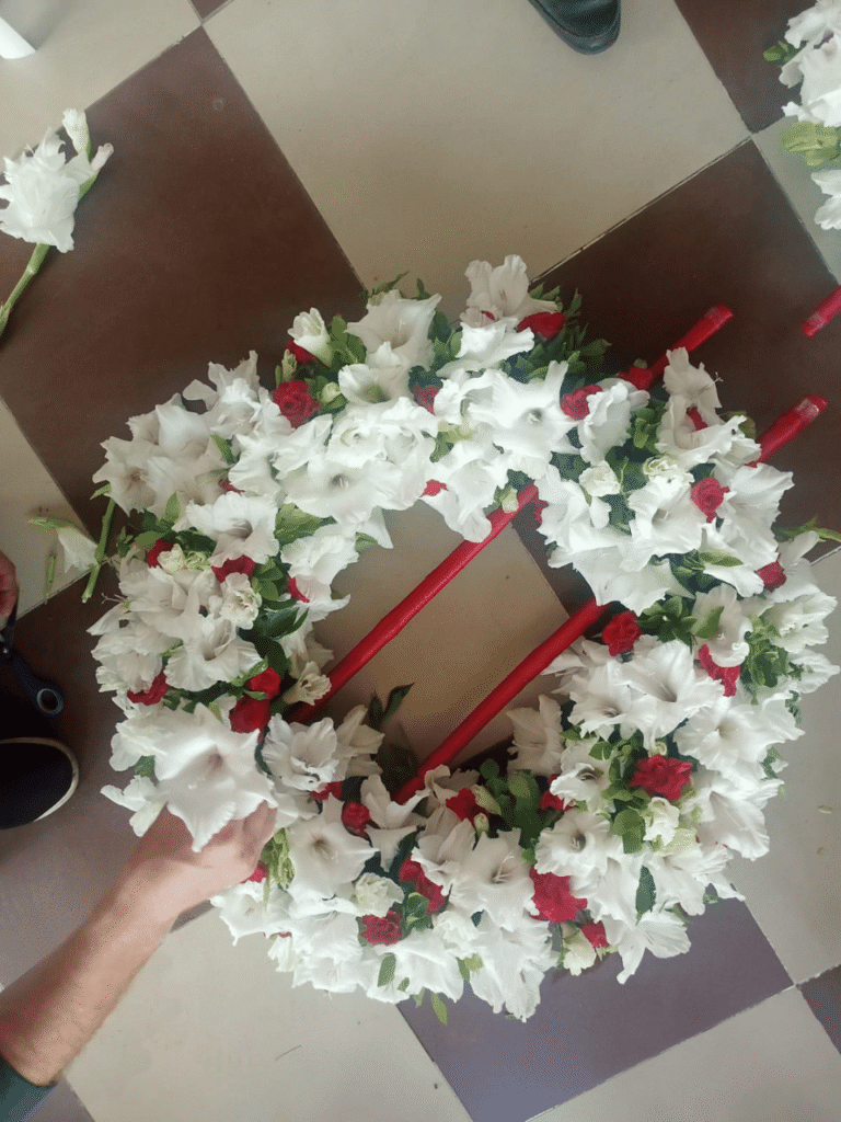 A classic and dignified standing wreath featuring an abundant mix of vibrant red roses and gladiolus, beautifully framed by crisp white accents. Ideal for expressing deep respect, love, and heartfelt condolences at formal occasions.