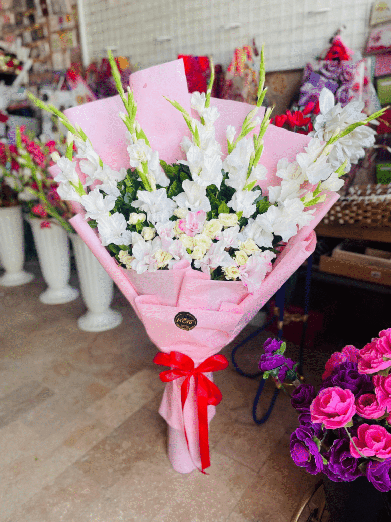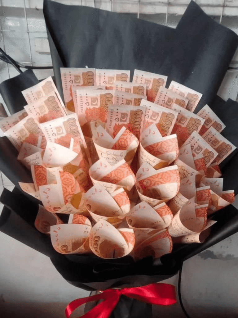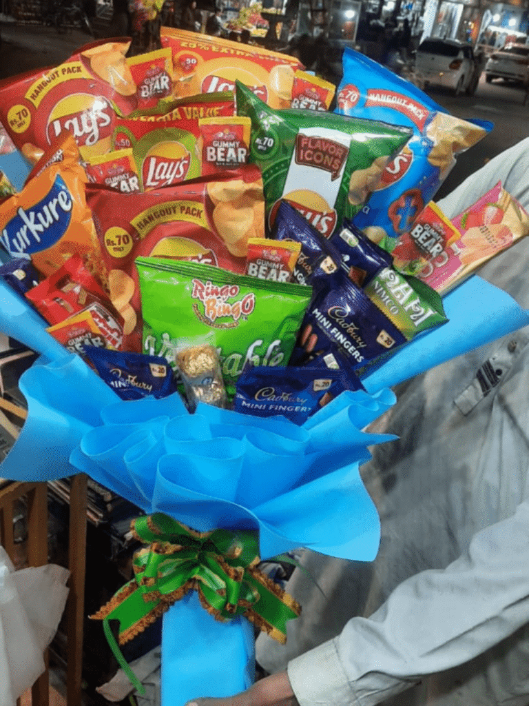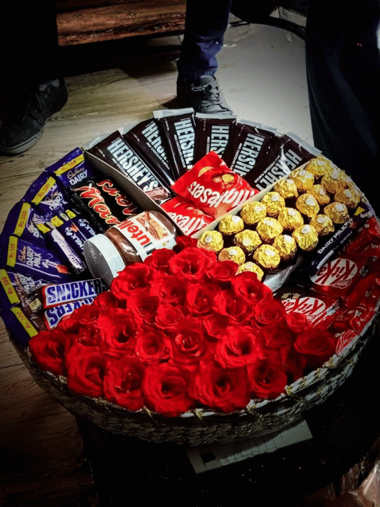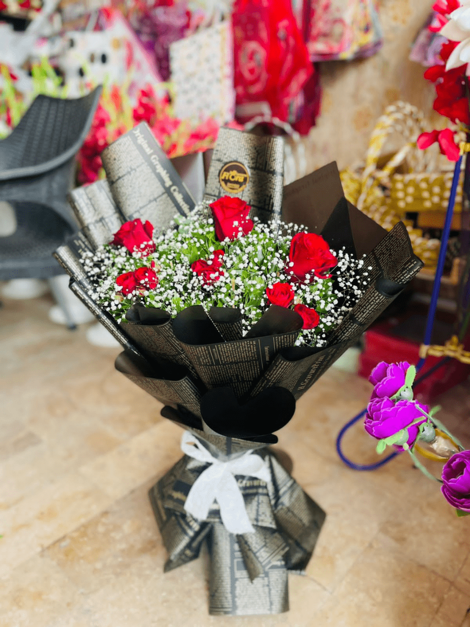 Yeh bouquet un logon ke liye perfect hai jo Classic Romance ko Unique aur Fashionable Packaging ke saath pasand karte hain. Ismein Vibrant Deep Red Roses (jo Passionate Love aur Deewangi ko signify karte hain) shamil hain. Roses ko ghane Baby’s Breath aur Greenery ne surround kiya hua hai, jo iske bold colour ko balance karta hai. Bouquet ki Wrapping bohot hi unique aur trendy hai: Black Paper jispar White Newspaper/Text Print bana hua hai, jo isko ek High-Fashion aur Artistic Look deta hai. Neeche White Ribbon bandha hua hai jo iske look ko complete karta hai. Yeh bouquet Anniversary, Valentine’s Day, Ya Apne Trendy Partner ki Birthday par dene ke liye ek behtareen aur stylish choice hai.