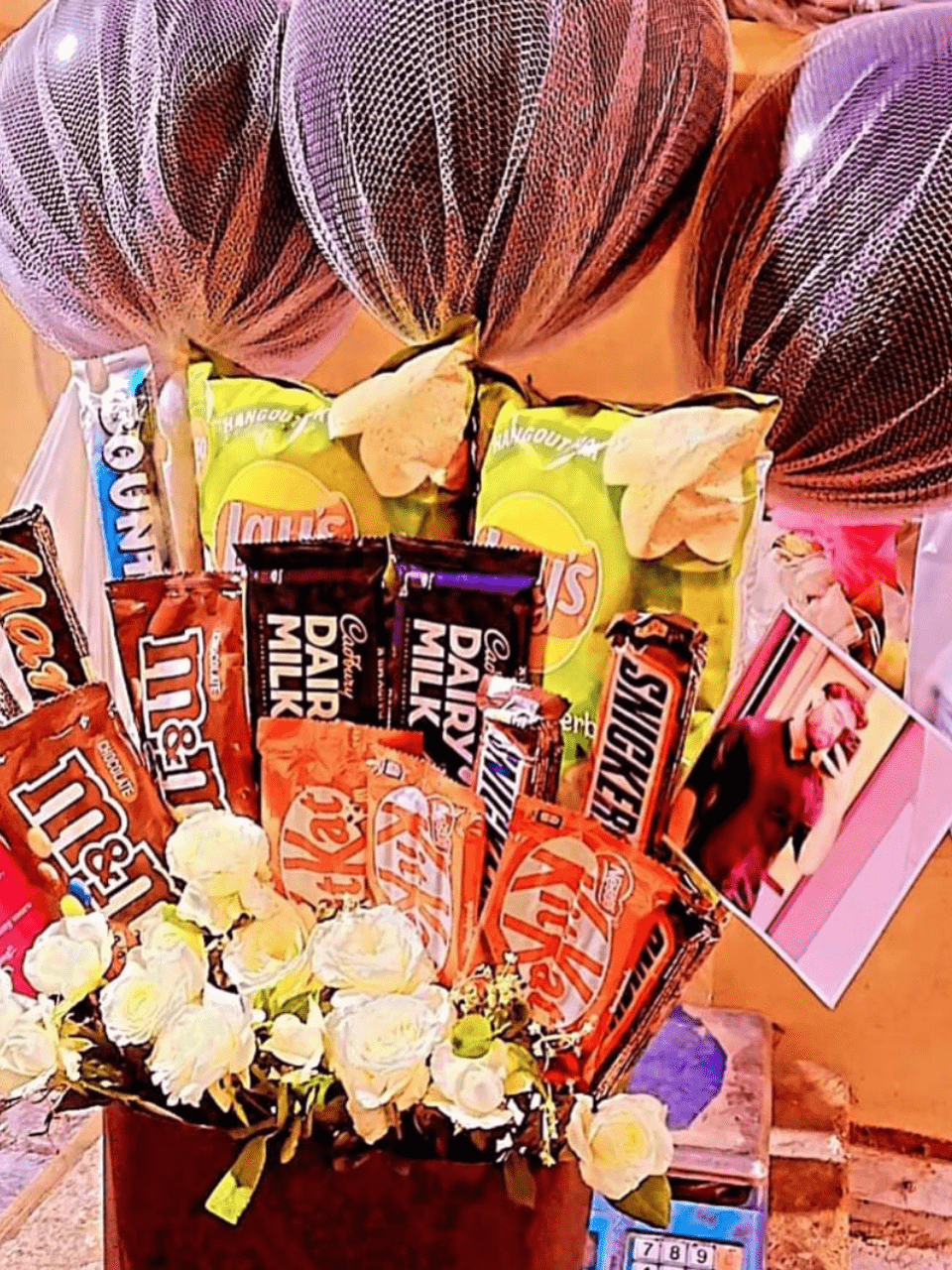 Yeh Gift Hamper un logon ke liye ideal hai jo Chocolate aur Snacks ke deewane hain. Ismein Multiple Chocolates (jaise Dairy Milk, Snickers, Mars, KitKat) aur Lay’s Chips ke packets hain, jo har tarah ke taste buds ko satisfy karein. Hamper ke base mein Fresh White Roses (jo Purity aur Admiration ko darshate hain) aur green foliage ka touch diya gaya hai, taake yeh ek proper gift ki look de. Box ke oopar Net-Covered Balloons aur ek Personalized Photo/Card bhi shamil hai. Yeh arrangement dikhata hai ke gift thoughtful aur fun hai. Aap isse Friend’s Birthday, Exam Pass Hone ki Khushi, Ya Jab Koi Khaas Dost Sad Ho tab de sakte hain. Yeh ek aisa gift hai jo har kisi ke chehre par smile laa dega.