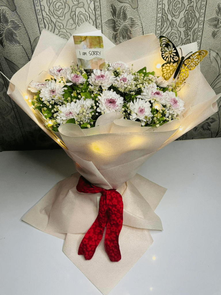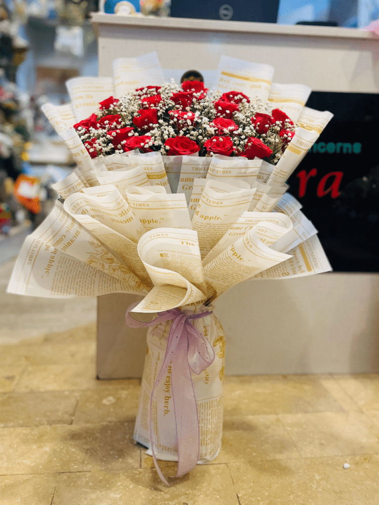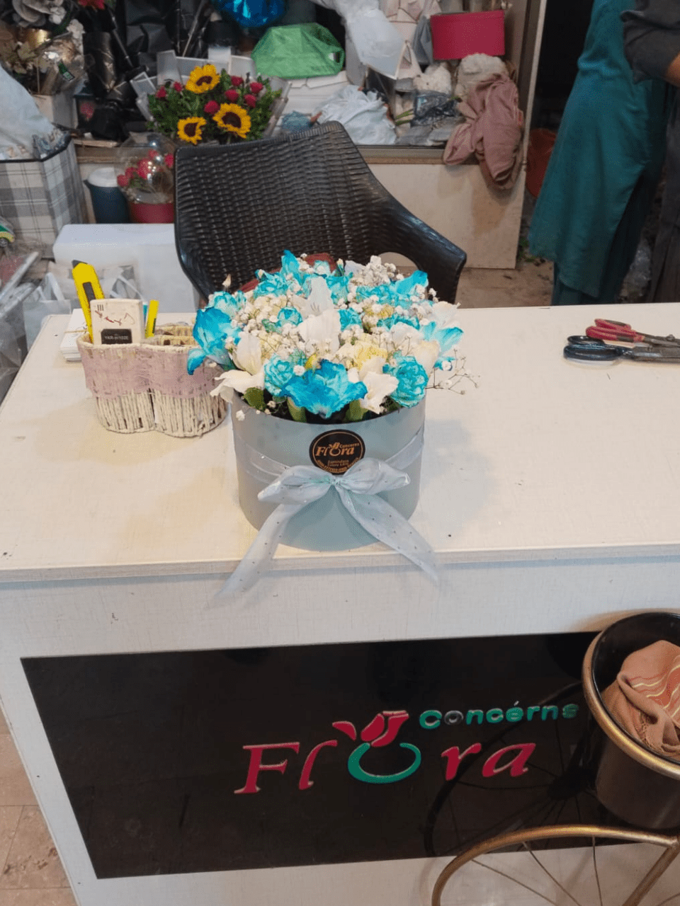 Yeh Flower Box Arrangement un logon ke liye ideal hai jo Unique Colors, Class aur Soothing Vibe pasand karte hain. Ismein Fresh White ya Cream Roses ka istemaal hua hai, jo Purity, Respect aur Innocence ko signify karte hain. White Roses ko surround kiya gaya hai Striking Blue-Dyed filler flowers (jaise Baby’s Breath) se. Blue colour Trust aur Loyalty ko represent karta hai, aur White ke saath milkar ek bohot hi Cool aur Attractive Contrast create karta hai. Box ki design Soft Light Blue/Grey color ki hai, jisko White Polka Dot Ribbon se tie kiya gaya hai. Yeh arrangement New Baby Boy Welcome, Birthday, Ya Apni Sincerity zahir karne ke liye ek behtareen aur yaadgar choice hai.