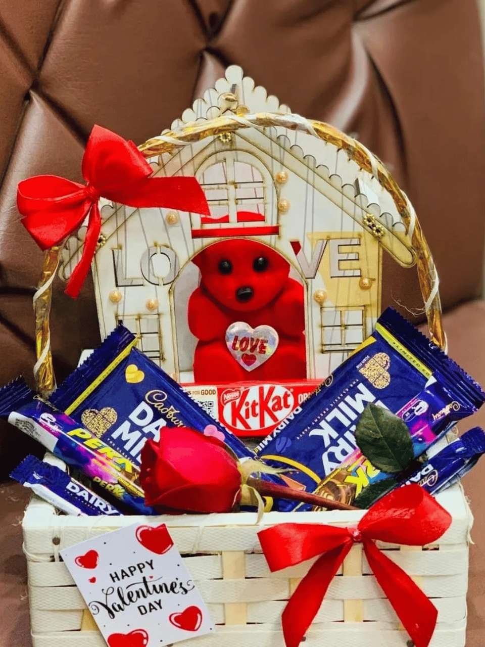The Presentation: Everything is beautifully set in a white woven basket, accented with two vibrant red satin bows and a “Happy Valentine’s Day” gift card.