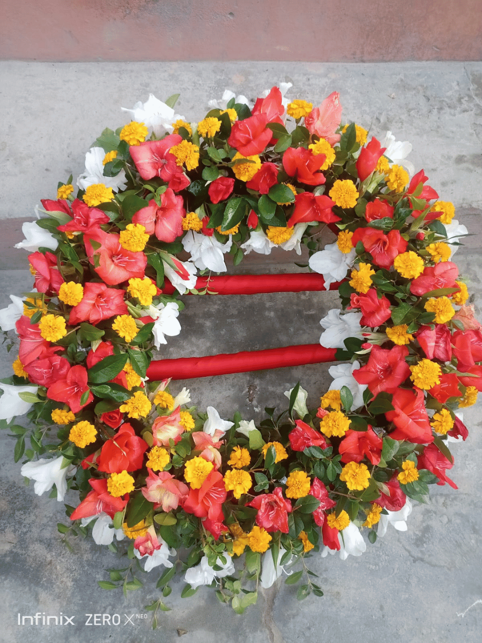 A vivid and culturally rich standing wreath featuring a mix of red gladiolus, white blooms, and bright yellow marigolds. This colorful arrangement is perfect for national ceremonies, cultural tributes, and expressing warm remembrances.