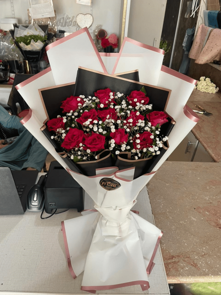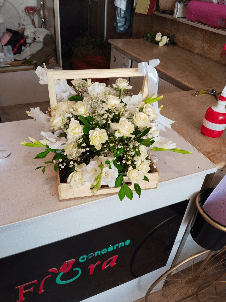 Yeh Flower Basket Arrangement un logon ke liye ideal hai jo Natural Charm, Elegance aur Long-Lasting Beauty pasand karte hain. Ismein Fresh White ya Cream Roses ka istemaal hua hai, jo Purity, Respect aur Innocence ko signify karte hain. Roses ke saath White Lilies ya Gladiolus (jo Elegance aur Strength dete hain) aur delicate Baby’s Breath ka touch hai. Yeh sab Green Foliage ke saath ek Rustic Light Brown Wooden Basket mein arrange kiye gaye hain. Basket ke handle par White Ribbon laga hua hai. Basket Arrangement ko Home Decor, Housewarming, Get Well Soon, Ya Formal Nikkah Ceremony par dene ke liye ek behtareen aur yaadgar choice hai.